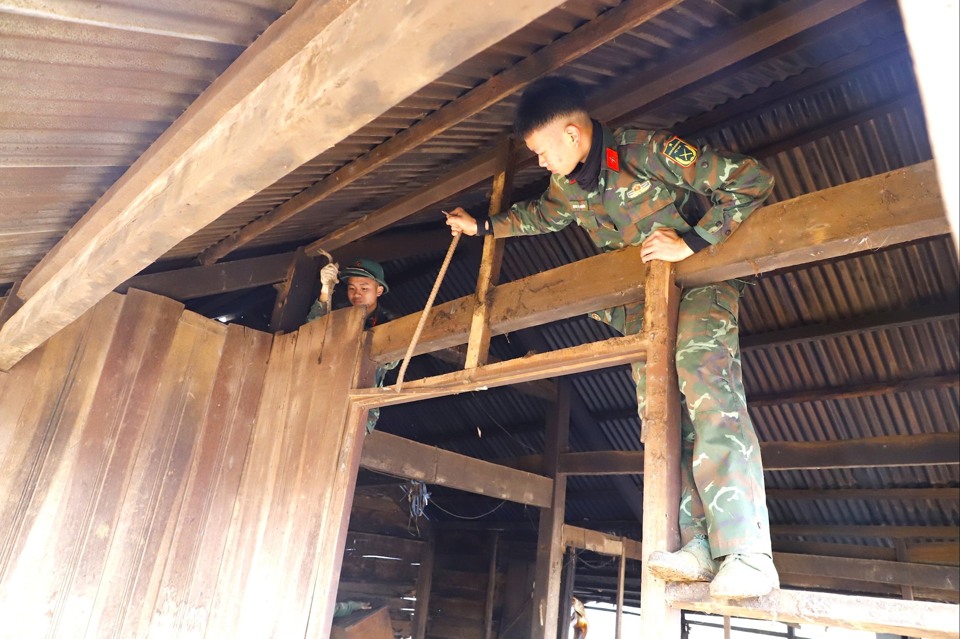 Ông Y Drah cùng cán bộ, chiến sĩ Đại đội Bộ binh 1 tham gia tháo dỡ căn nhà cũ đã xuống cấp, mục nát, tạo mặt bằng để nhà thầu triển khai thi công