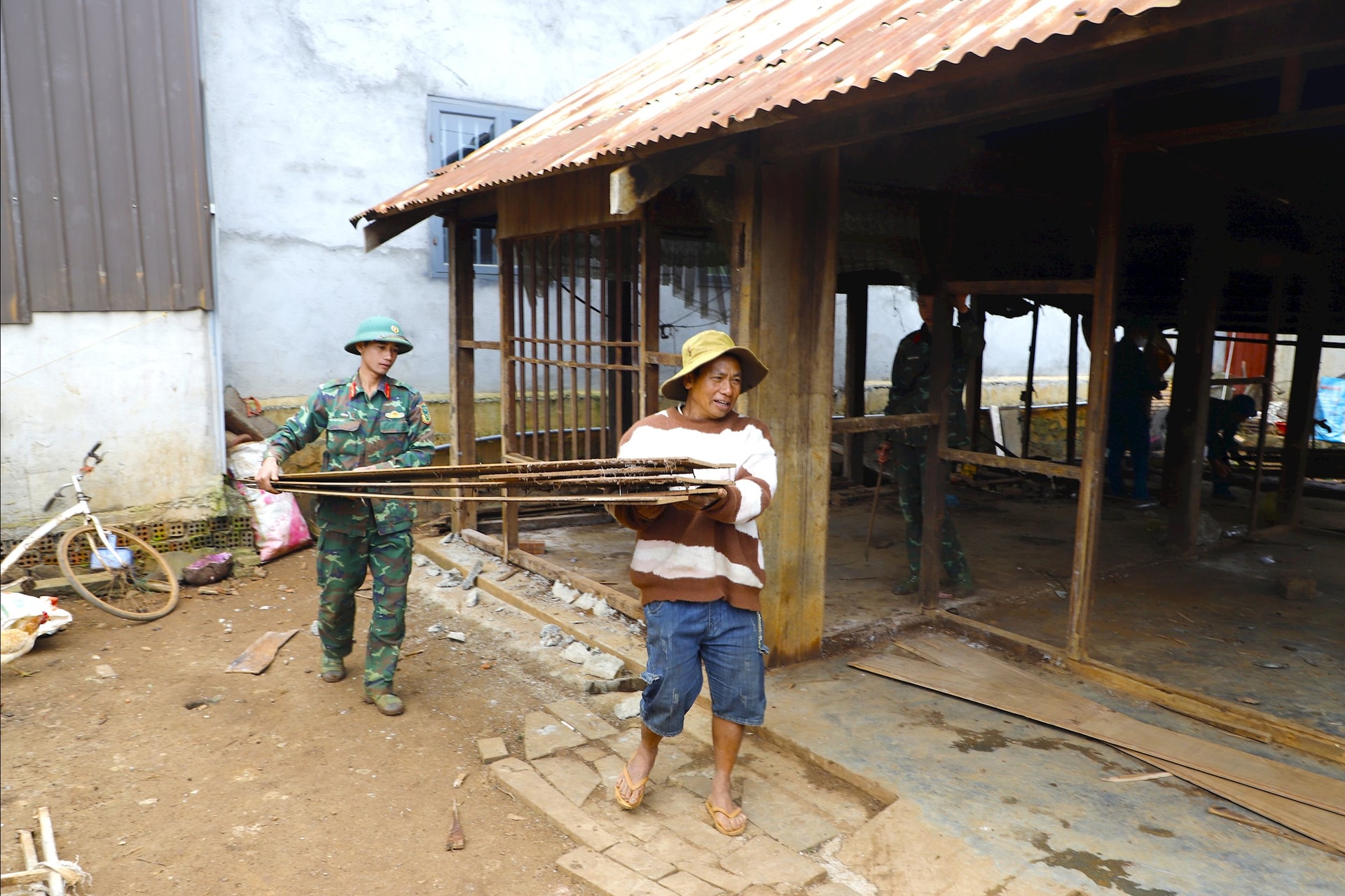 Lực lượng vũ trang hỗ trợ di dời nhà cũ của gia đình ông Y Drah tại bon Sa Pa