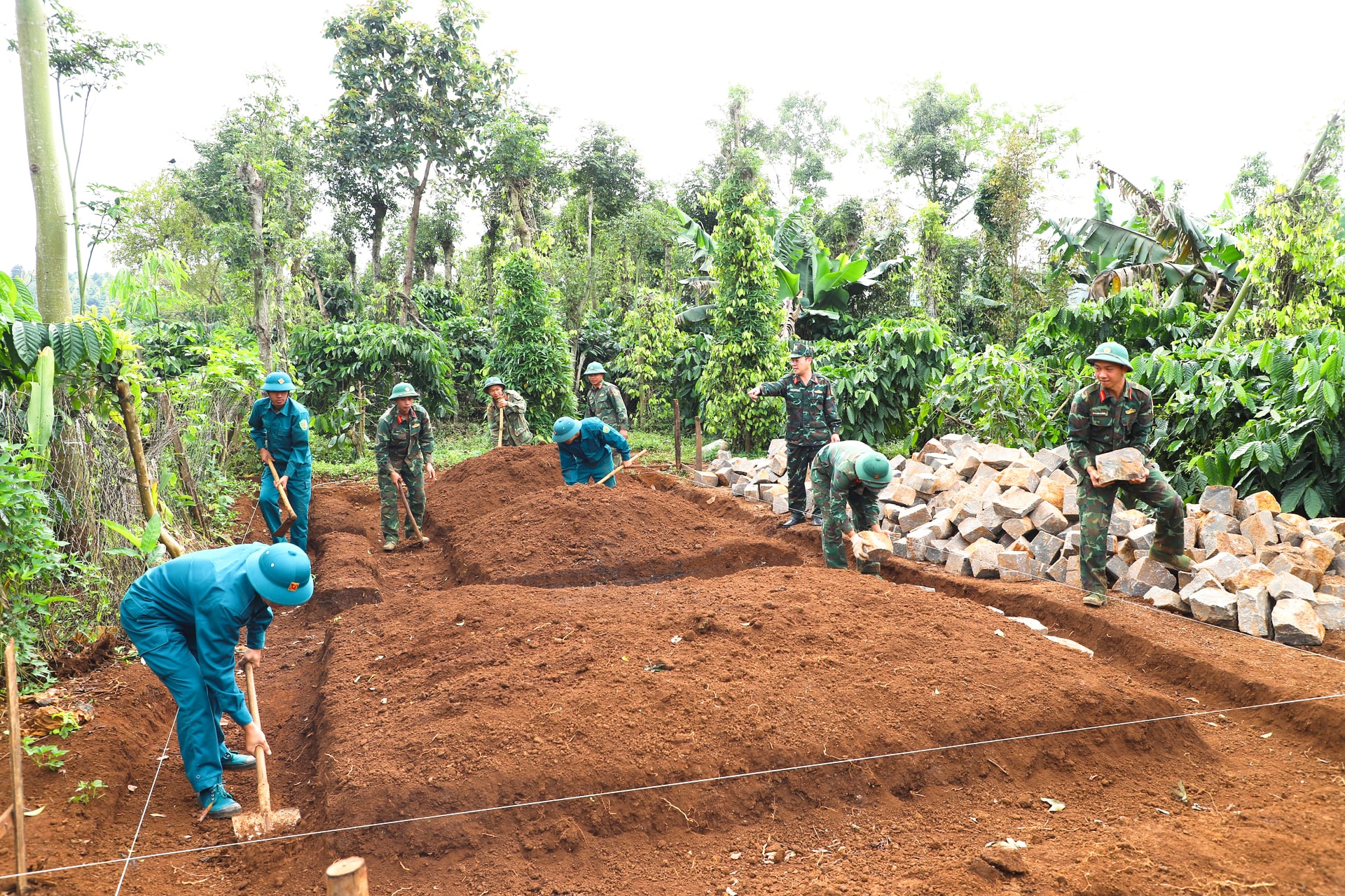 Ban Chỉ huy PTKV 2 - Đông Gia Nghĩa đã huy động hơn 30 cán bộ, chiến sĩ thuộc Đại đội Bộ binh 1 và Ban CHQS xã Thuận An trực tiếp tham gia tháo dỡ, vận chuyển vật liệu và chuẩn bị mặt bằng thi công.
