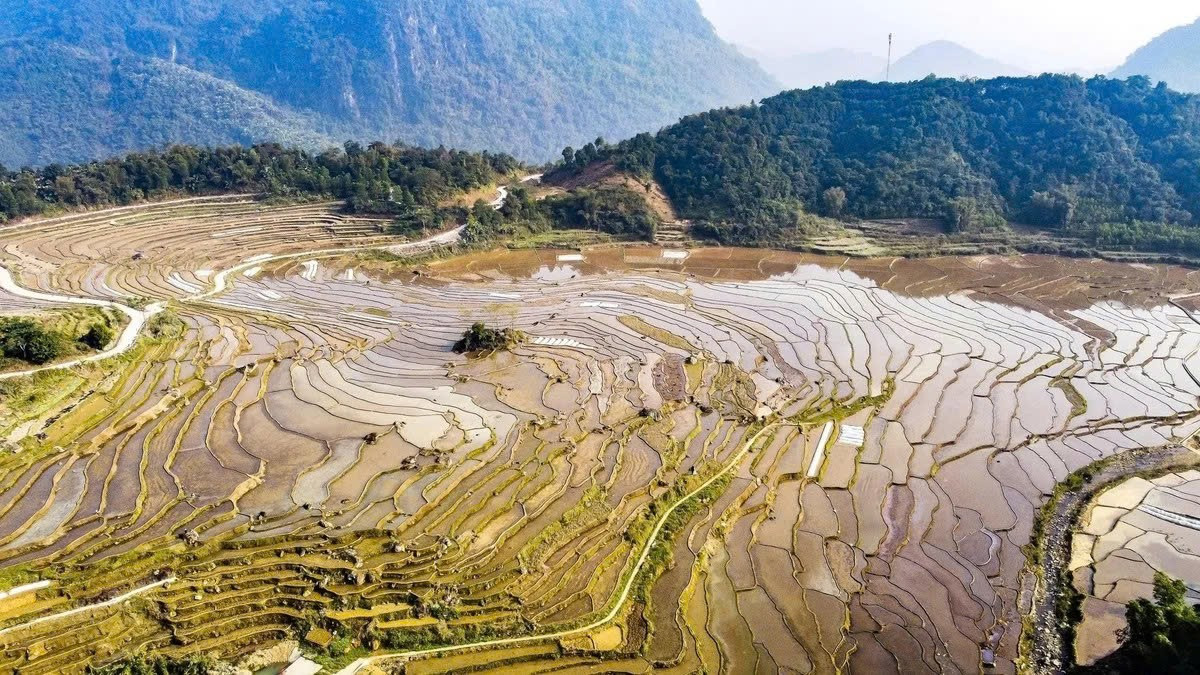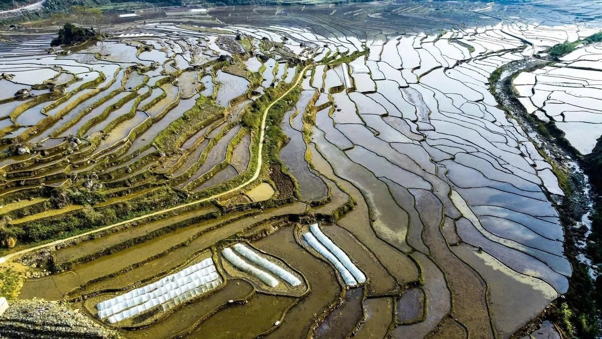 Từ các khe suối trên cao, dòng nước mát lành len lỏi qua những triền đồi, lấp đầy từng bậc ruộng uốn cong mềm mại. Mặt ruộng phẳng lặng phản chiếu mây trời, núi non và những mái nhà sàn nép mình bên sườn dốc. Ảnh PLO