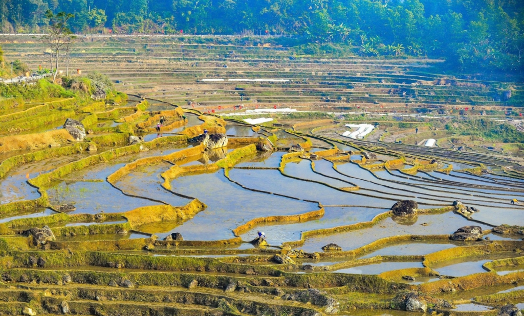 Giữa khung cảnh ấy, nhịp sống lao động của đồng bào các dân tộc thiểu số hiện lên bình dị mà sống động. Người dân ra đồng từ sớm, tỉ mẩn gia cố bờ ruộng, điều tiết dòng nước, chăm sóc những luống mạ non. Những công việc quen thuộc, lặp đi lặp lại qua bao thế hệ, vẫn diễn ra chậm rãi và hài hòa như chính nhịp thở của núi rừng Pù Luông. Ảnh Nông nghiệp và môi trường