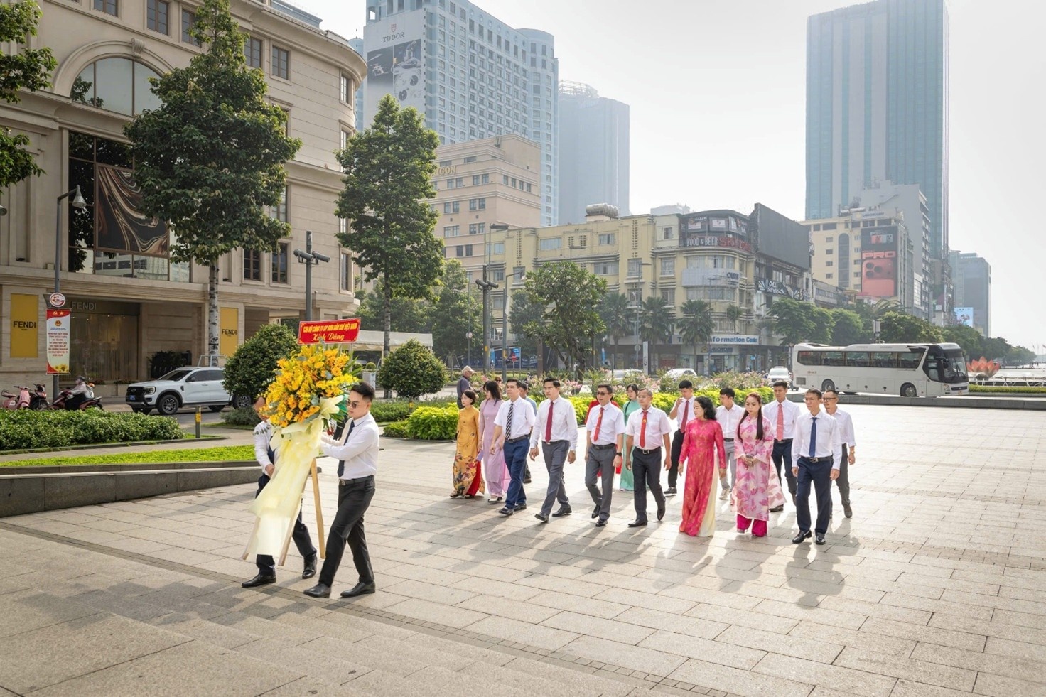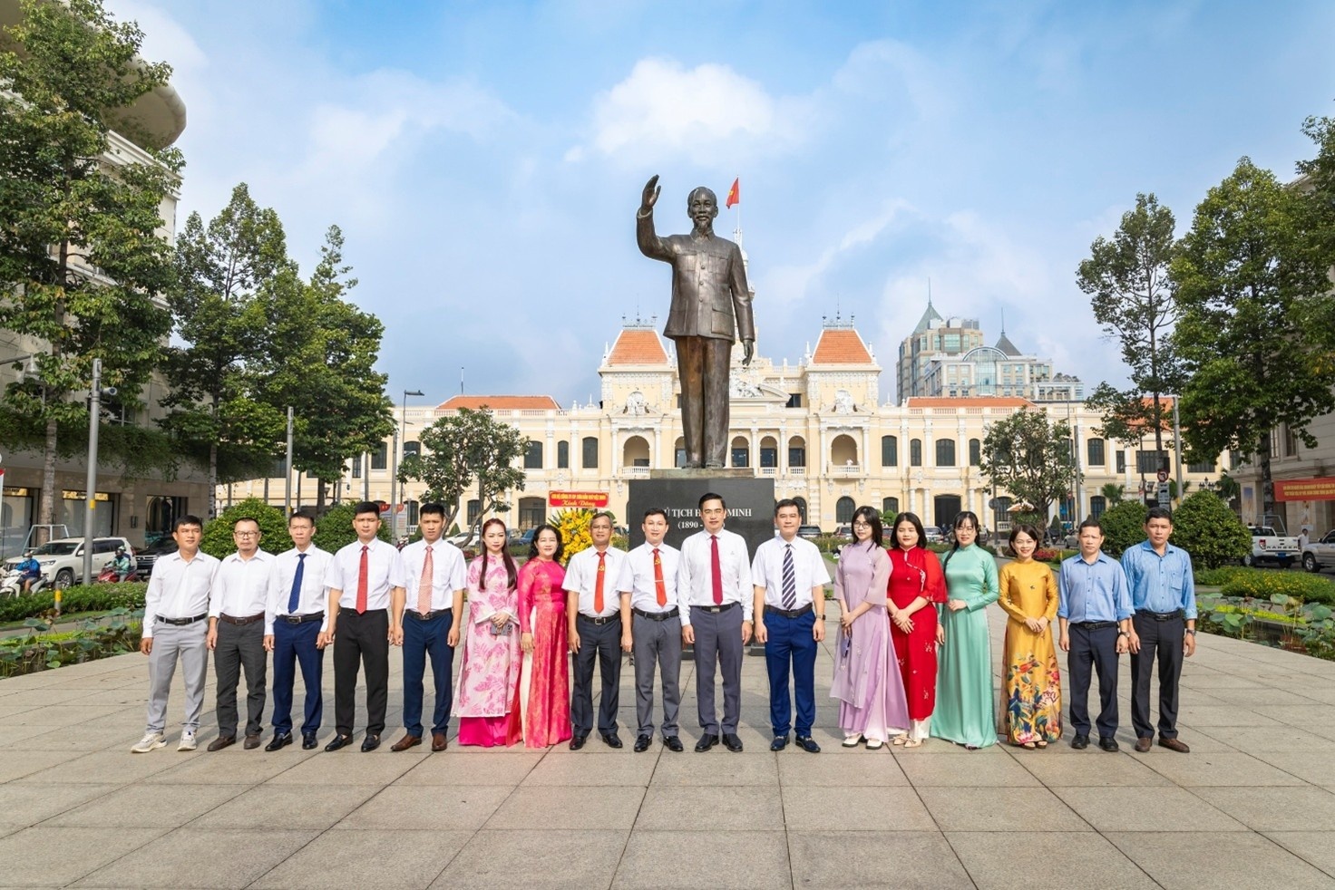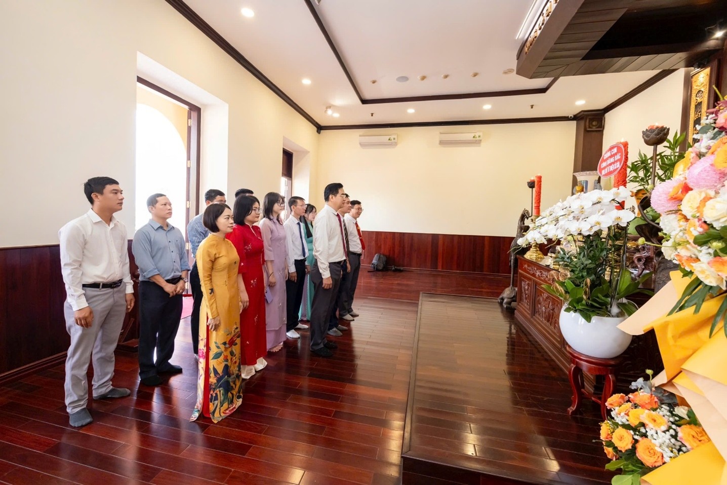 Đoàn thực hiện nghi lễ dâng hoa tại Tượng đài Chủ tịch Hồ Chí Minh.