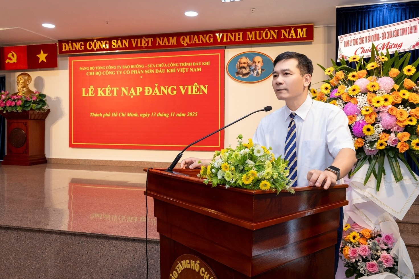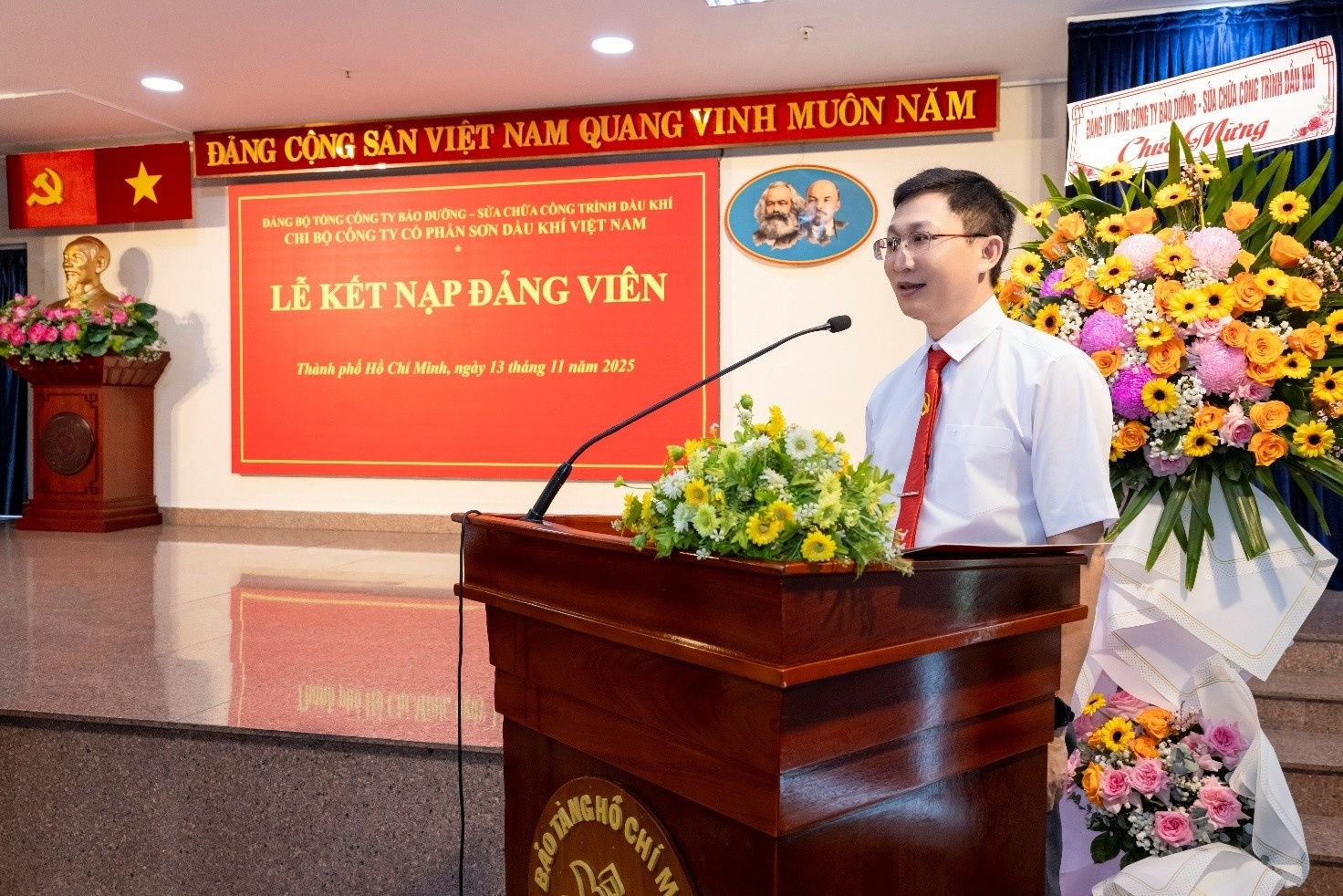 Phát biểu tại buổi lễ, đồng chí Nguyễn Trung Trí, Bí thư Đảng ủy, Chủ tịch Hội đồng quản trị PVMR chúc mừng Chi bộ PV Paint và hai đảng viên mới. Đồng chí khẳng định việc kết nạp đảng viên hôm nay là niềm vinh dự lớn lao, đồng thời là kết quả của quá trình rèn luyện, phấn đấu bền bỉ. Đồng chí tin tưởng các đảng viên mới sẽ tiếp tục tu dưỡng, học hỏi, hoàn thành xuất sắc nhiệm vụ được giao; lan tỏa tinh thần cống hiến, truyền cảm hứng cho thế hệ trẻ, góp phần xây dựng Chi bộ PV Paint ngày càng vững mạnh.