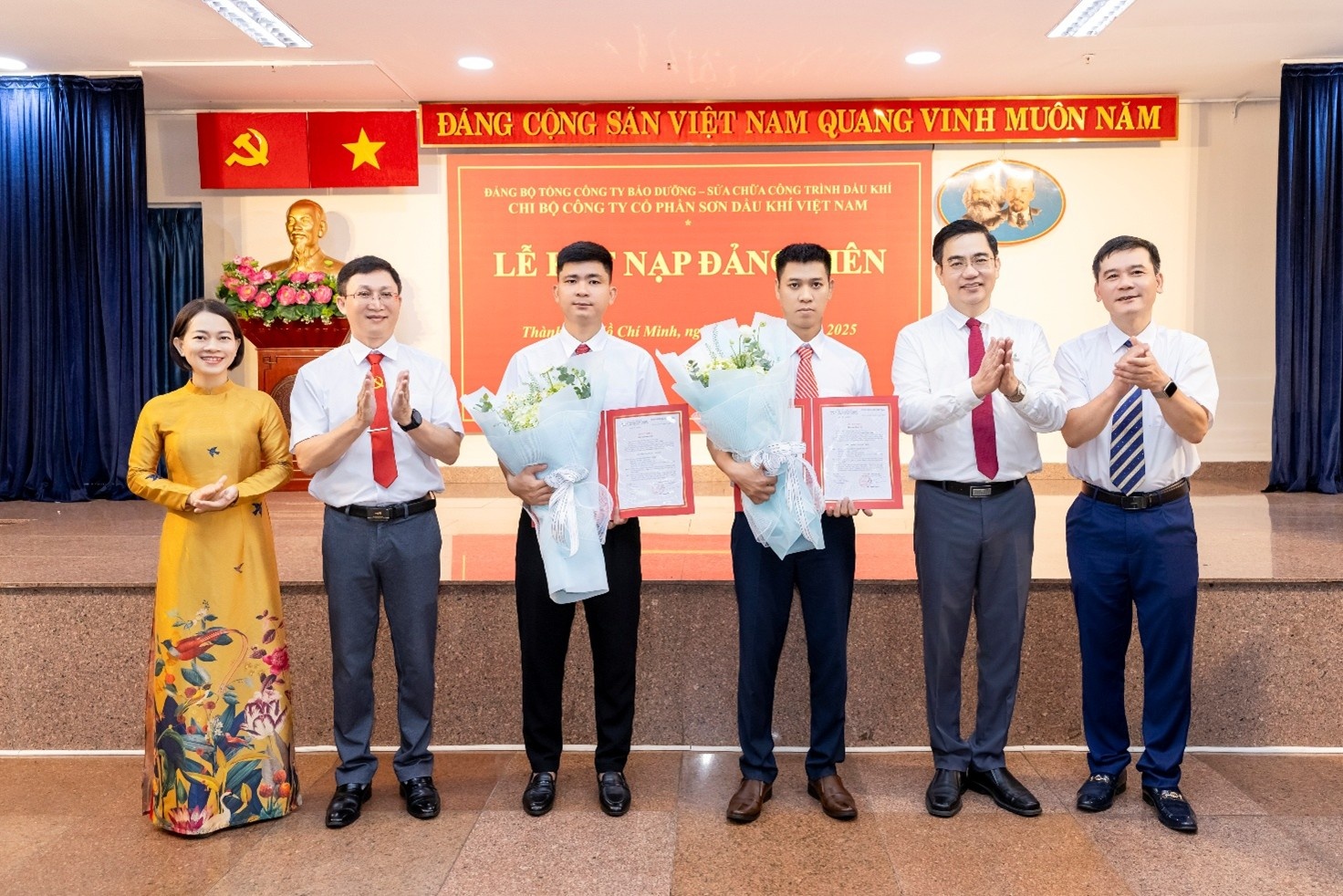 Các đồng chí lãnh đạo PVMR và PV Paint trao các quyết định kết nạp đảng viên và chúc mừng 2 đảng viên mới.