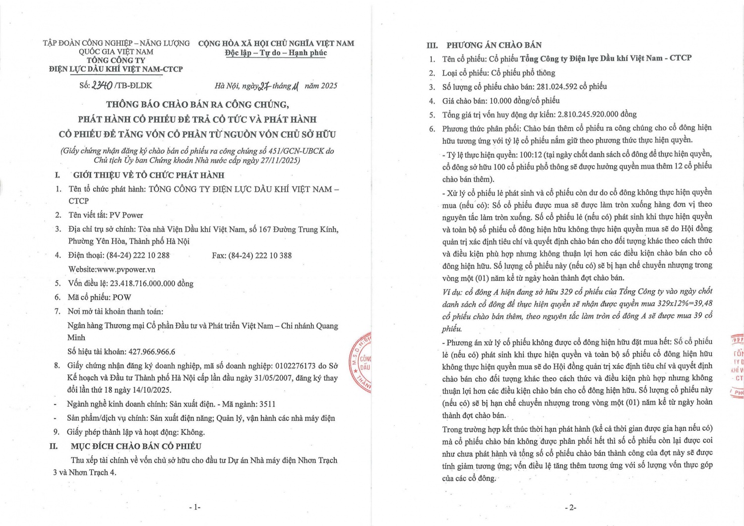 Theo thông báo, PV Power sẽ chào bán thêm 281.024.592 cổ phiếu cho cổ đông hiện hữu theo phương thức thực hiện quyền với giá chào bán 10.000 đồng/cổ phiếu. Tổng giá trị vốn huy động dự kiến đạt 2.810 tỷ đồng, phục vụ thu xếp nguồn vốn chủ sở hữu cho hai dự án điện khí LNG Nhơn Trạch 3 và 4.