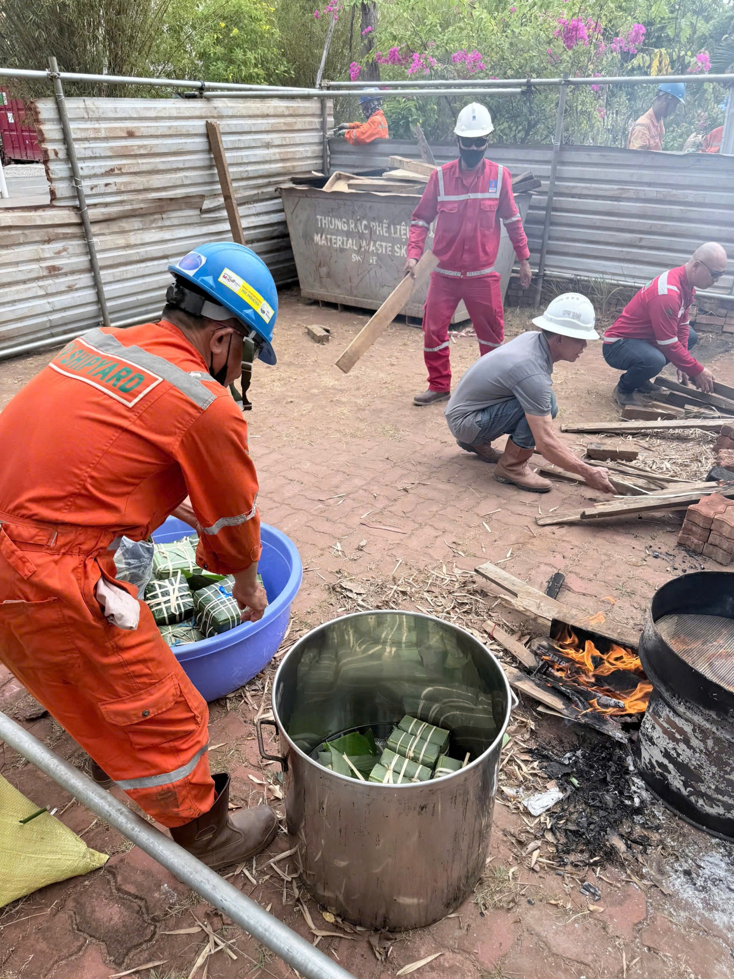 Không gian sản xuất thường ngày bỗng trở nên gần gũi hơn khi cán bộ, công nhân viên cùng nhau chuẩn bị từng công đoạn cho nồi bánh chưng ngày Tết: từ vo nếp, rửa lá, sơ chế đậu xanh, thịt ba chỉ đến tự tay gói từng chiếc bánh. Những thao tác còn vụng về của người lần đầu gói bánh nhanh chóng được bù đắp bằng tiếng cười, sự sẻ chia và tinh thần đồng đội – điều vốn là “chất keo” gắn kết tập thể PV Shipyard trong suốt quá trình lao động, sản xuất.