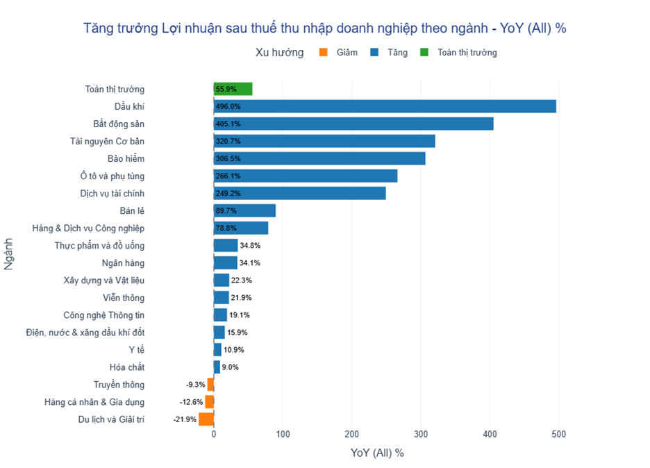 Thống kê của Yuanta Việt Nam tính đến ngày 26/10 cho biết, đến thời điểm hiện tại đã có 589/1594 doanh nghiệp đã công bố kết quả kinh doanh quý III/2025 và chiếm tỷ lệ vốn hóa 0,24% so với thị trường chung. Mức tăng trưởng doanh thu và lợi nhuận của thị trường đạt lần lượt 14,8% và 55,89% so với cùng kỳ, trong đó Dầu khí và Bất động sản là hai nhóm ngành tăng trưởng mạnh nhất cả về doanh thu và lợi nhuận.