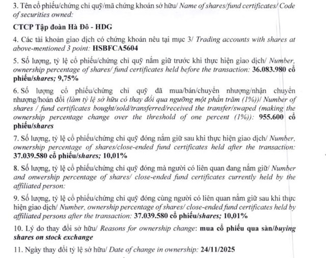 Trước đó, vào cuối tháng 10/2025, quỹ ngoại này cũng đã mua vào thành công 3 triệu cổ phiếu HDG thông qua giao dịch trên sàn, qua đó nâng tổng lượng sở hữu của Pyn Elite Fund tại Hà Đô từ gần 31,6 triệu cổ phiếu lên gần 34,6 triệu cổ phiếu.