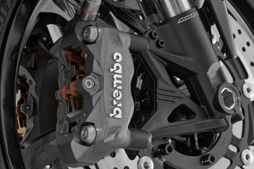 Hệ thống giảm xóc trước sử dụng phuộc USD Marzocchi và phuộc sau monoshock có thể điều chỉnh tải trước mang lại khả năng kiểm soát tốt hơn ở tốc độ cao. Hệ thống phanh bao gồm đĩa kép 300 mm với kẹp phanh Brembo bốn piston ở phía trước và đĩa sau 240 mm với kẹp đơn, đi kèm ABS hai kênh tiêu chuẩn giúp cải thiện an toàn khi phanh gấp.