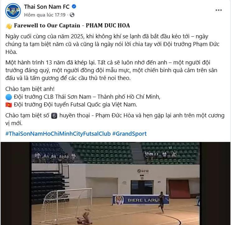 Vào ngày cuối cùng của năm 2025, làng thể thao Việt Nam chính thức chia tay một trong những biểu tượng lớn nhất của bộ môn futsal. CLB Thái Sơn Nam TP.HCM đã xác nhận đội trưởng Phạm Đức Hòa quyết định giã từ sự nghiệp thi đấu đỉnh cao, khép lại hành trình 13 năm đầy rẫy vinh quang và những nỗ lực phi thường.
