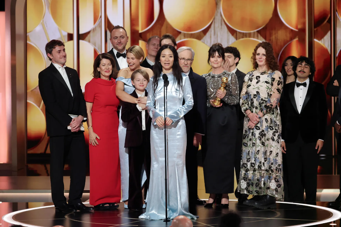 Đạo diễn Chlóe Zhao và ê kíp phim "Hamnet" trên bục nhận giải. (Ảnh: Getty).
