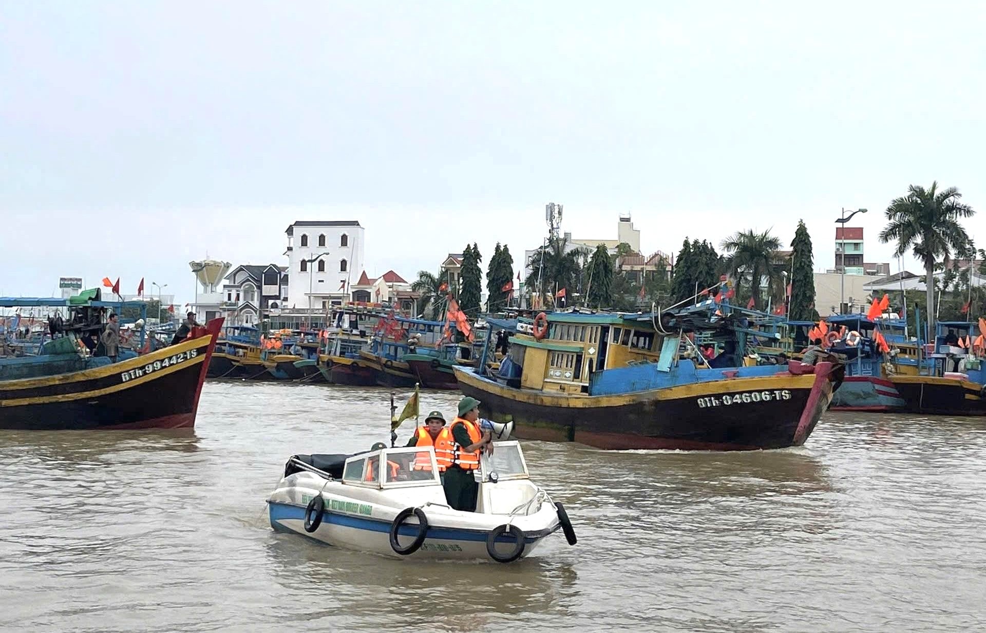 Cán bộ, chiến sĩ Đồn Biên phòng Thanh Hải tuyên truyền, kêu gọi ngư dân sắp xếp, neo đậu tàu thuyền bảo đảm an toàn trước khi bão đổ bộ