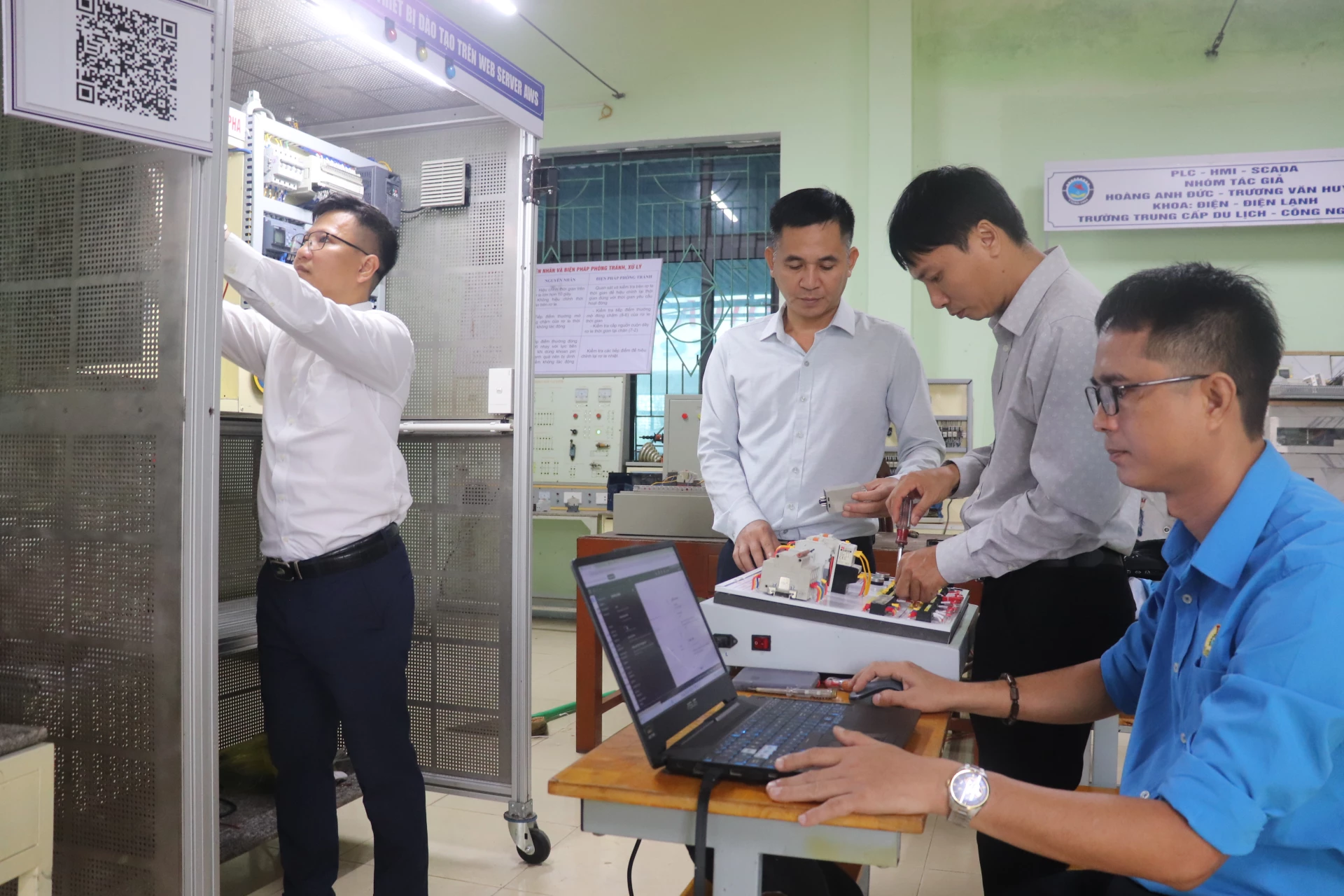 - P.V: Xin chào thầy! Trước hết chúc mừng thầy và các cộng sự đã giành được giải cao nhất tại Hội thi thiết bị đào tạo tự làm lần thứ I, năm 2025. Thầy có thể giới thiệu cụ thể hơn về mô hình "Điều khiển, giám sát thiết bị đào tạo trên Web Server AWS"?