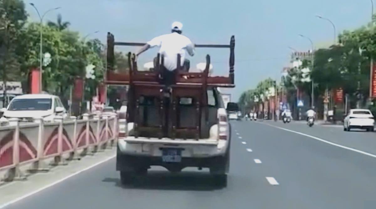 Trước đó, người dân tại khu vực trung tâm phường Hương Trà (TP Huế) phản ánh xe ô-tô bán tải BKS 75M-000.25 chở bàn ghế xếp chồng phía sau thùng. Đáng chú ý, một người đàn ông ngồi trên số hàng hóa này khi xe đang di chuyển. Ngay sau khi tiếp nhận thông tin, Phòng CSGT Công an TP Huế đã chỉ đạo lực lượng chức năng vào cuộc xác minh, làm rõ tài xế vi phạm là anh N.X.F. (1984, trú phường Hương Trà). Đội CSGT đường bộ số 1 đã lập biên bản vi phạm hành chính đối với tài xế N.X.F. về 2 hành vi: “Chở người trên thùng xe trái quy định”, “Vận chuyển hàng hóa không chằng buộc”; đồng thời trừ 6 điểm giấy phép lái xe.