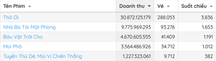 Mùa phim Tết Bính Ngọ 2026 khởi động bằng một cuộc đua chưa từng có khi bốn phim Việt đồng loạt ra rạp từ mùng 1 gồm Thỏ ơi!!, Nhà ba tôi một phòng, Báu Vật Trời Cho và Mùi phở. Sau ngày đầu tiên, phòng vé thu về hơn 50 tỷ đồng, trong đó Thỏ ơi!! của Trấn Thành chiếm ưu thế áp đảo với hơn 30 tỷ đồng, tương đương gần 62% thị phần. Phần còn lại chia đều cho ba tác phẩm gia đình dán nhãn K.