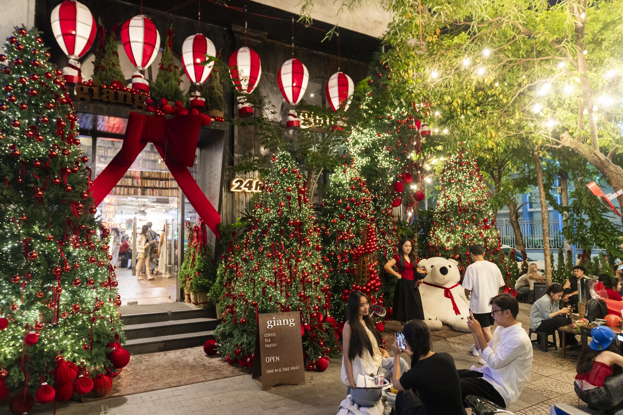 Dù còn hơn 2 tháng nữa mới đến Giáng Sinh, bên ngoài quán đã ngập tràn không khí lễ hội với những cây thông cao 2-3 m, trang trí bằng quả châu đỏ và dây đèn đom đóm lấp lánh. Đại diện quán cho biết quán đã bắt đầu chuyển sang concept Noel từ cuối tháng 9 để tạo không gian sớm cho khách đến chụp ảnh và tận hưởng không khí mùa lễ hội.
