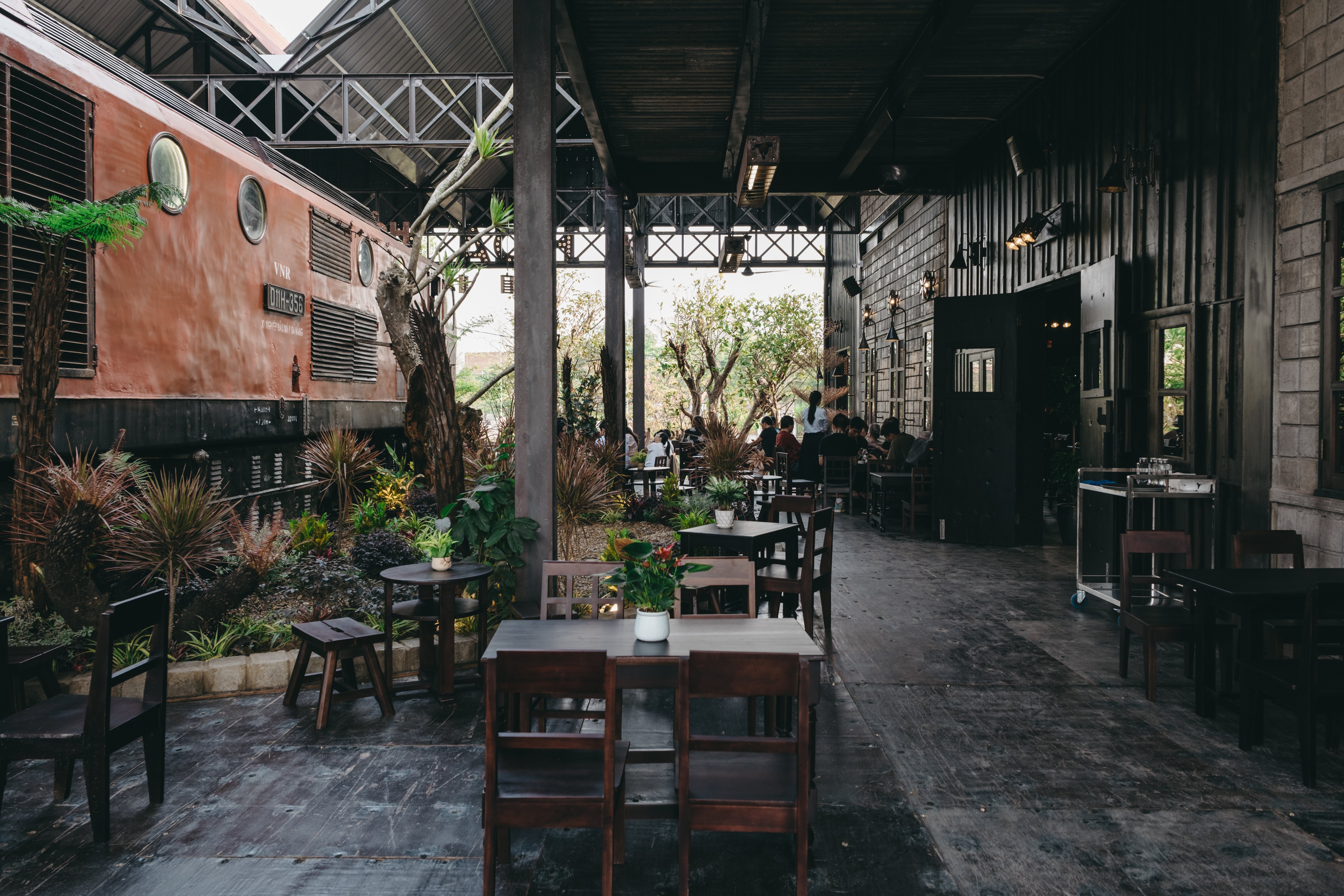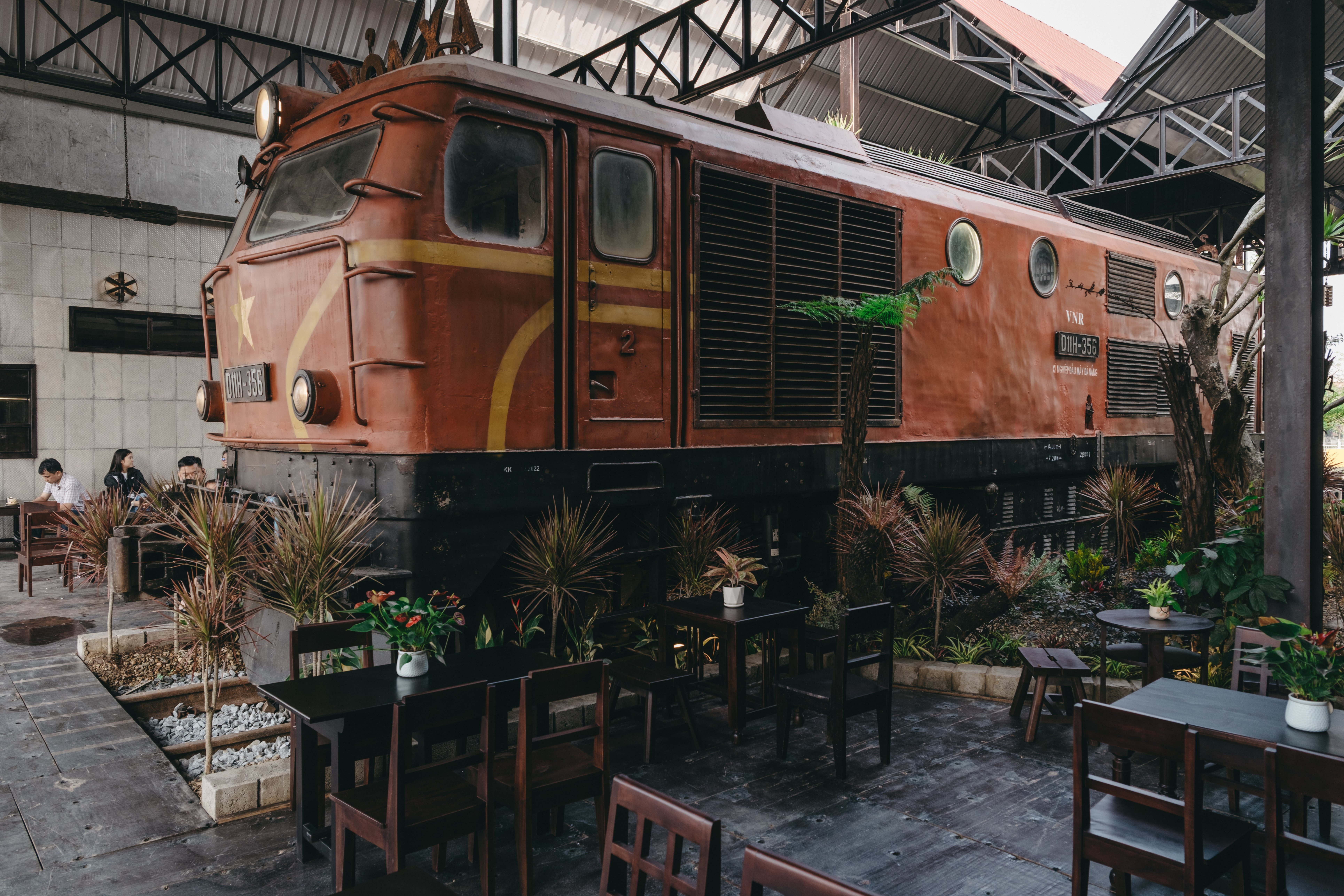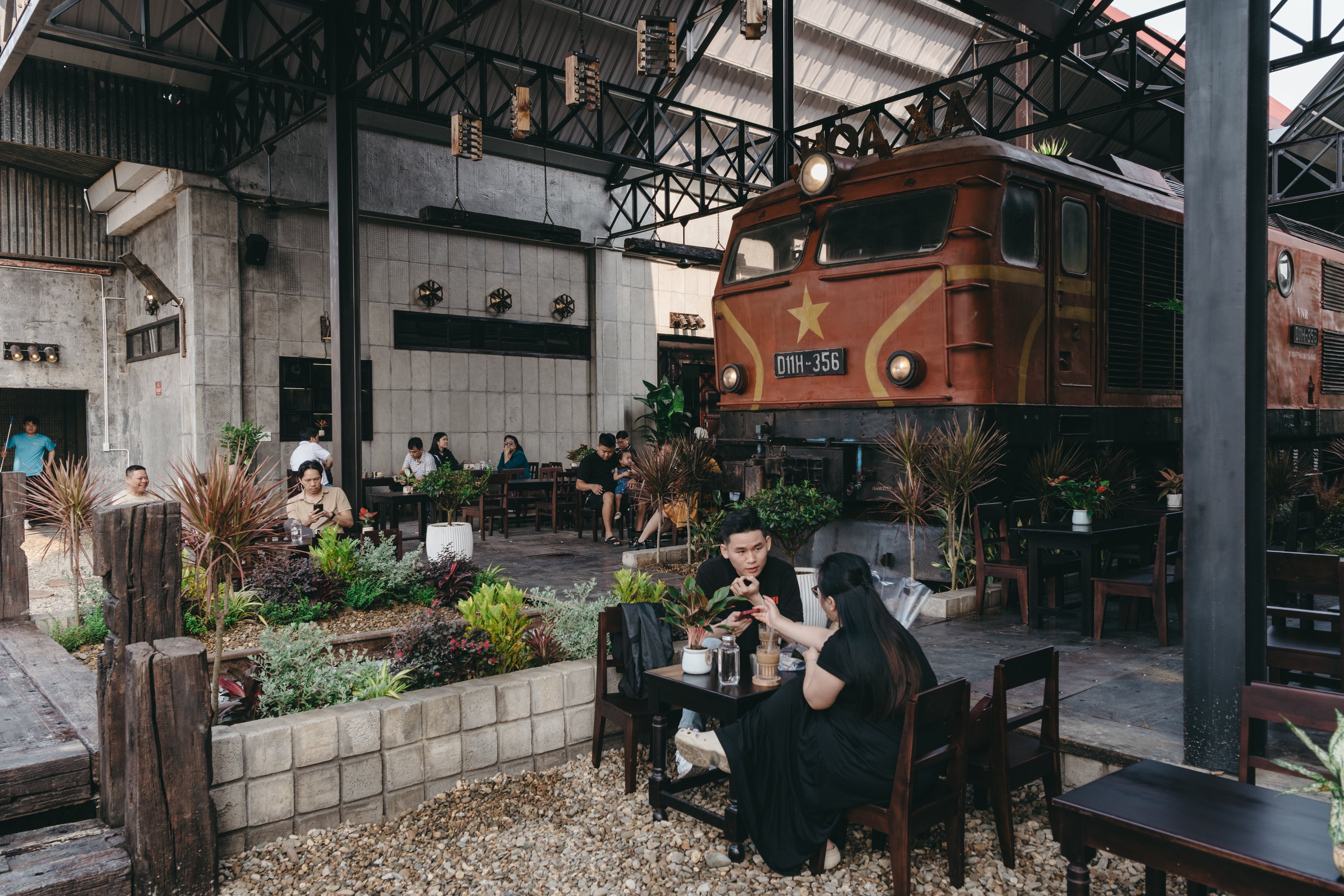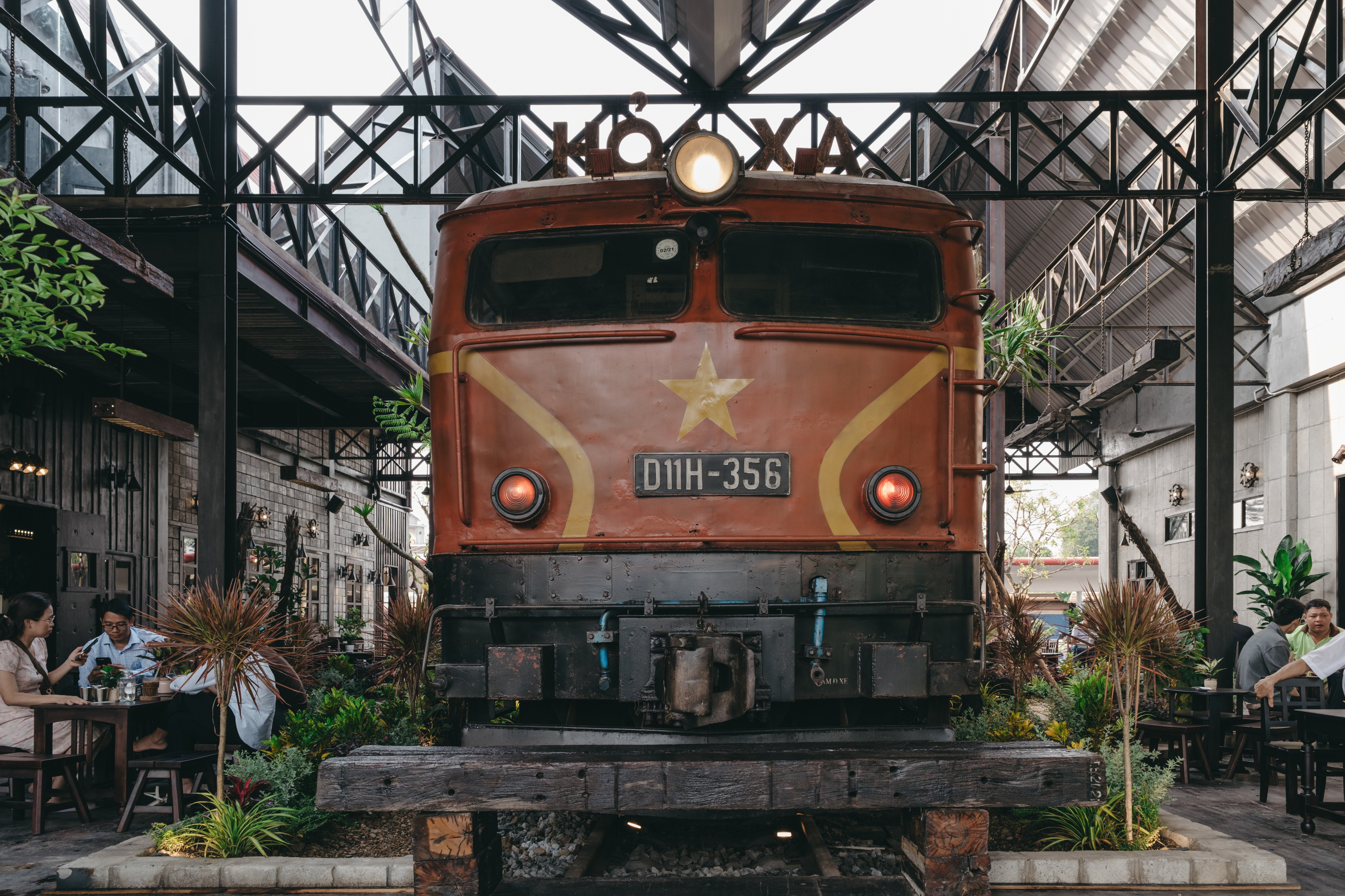 Đại diện quán cho biết đầu máy xe lửa đặt tại khu vực trung tâm là đầu máy cũ, được tận dụng làm điểm nhấn trang trí. Không gian quán nằm sát ga Huế, từ vị trí ngồi, khách có thể quan sát tàu chạy qua mà vẫn đảm bảo khoảng cách an toàn.
