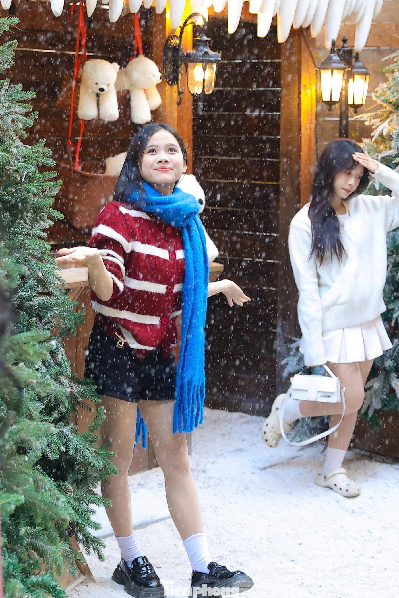 Các bạn trẻ rất thích thú khi được chứng kiến tuyết nhân tạo rơi, thoải mái tạo dáng chụp hình, quay clip.