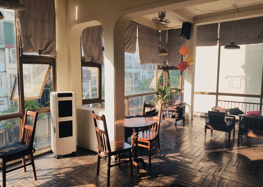 Một quán cà phê vintage quen thuộc khác của nhiều bạn trẻ là Hiên Cà phê tại số 1 ngõ 14 Huỳnh Thúc Kháng. Quán có phong cách cổ điển với không gian mở thoáng mát và thiết kế hai tầng. Trong đó, một phòng có bàn dài phù hợp cho các buổi gặp mặt đông người hoặc workshop.