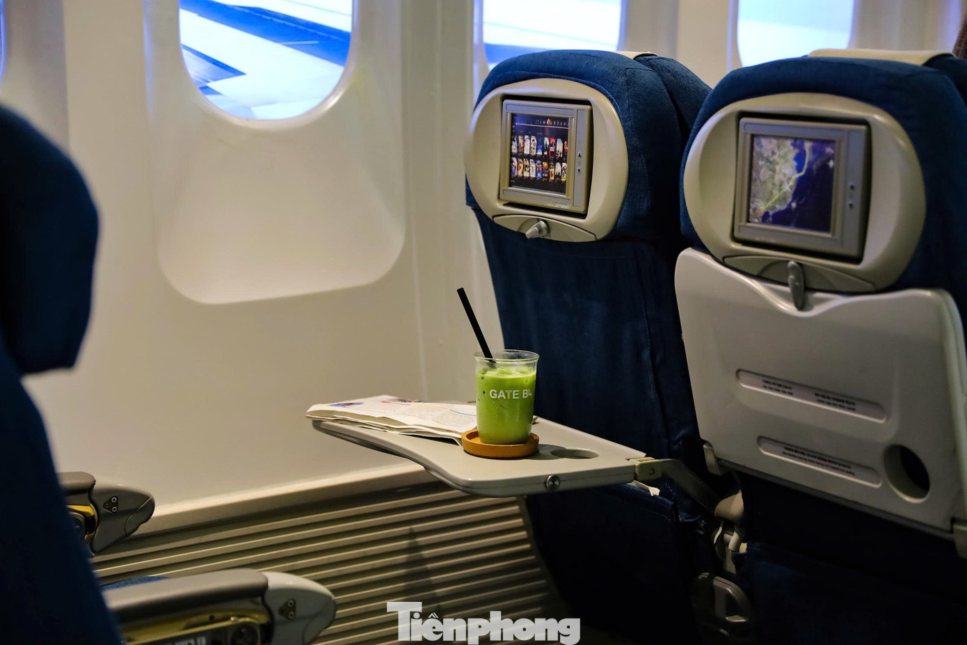 Quán không chỉ phục vụ cà phê và đồ ăn nhẹ mà còn có menu đồ uống đa dạng từ 35.000 đến 80.000 cho những nhóm bạn muốn chill cùng nhau. Từ ly, khay thức ăn đến cả nhà vệ sinh đều được mô phỏng gần như y hệt phiên bản trên máy bay. Không gian ánh đèn vàng tạo cảm giác ấm cúng và gần gũi cho thực khách.