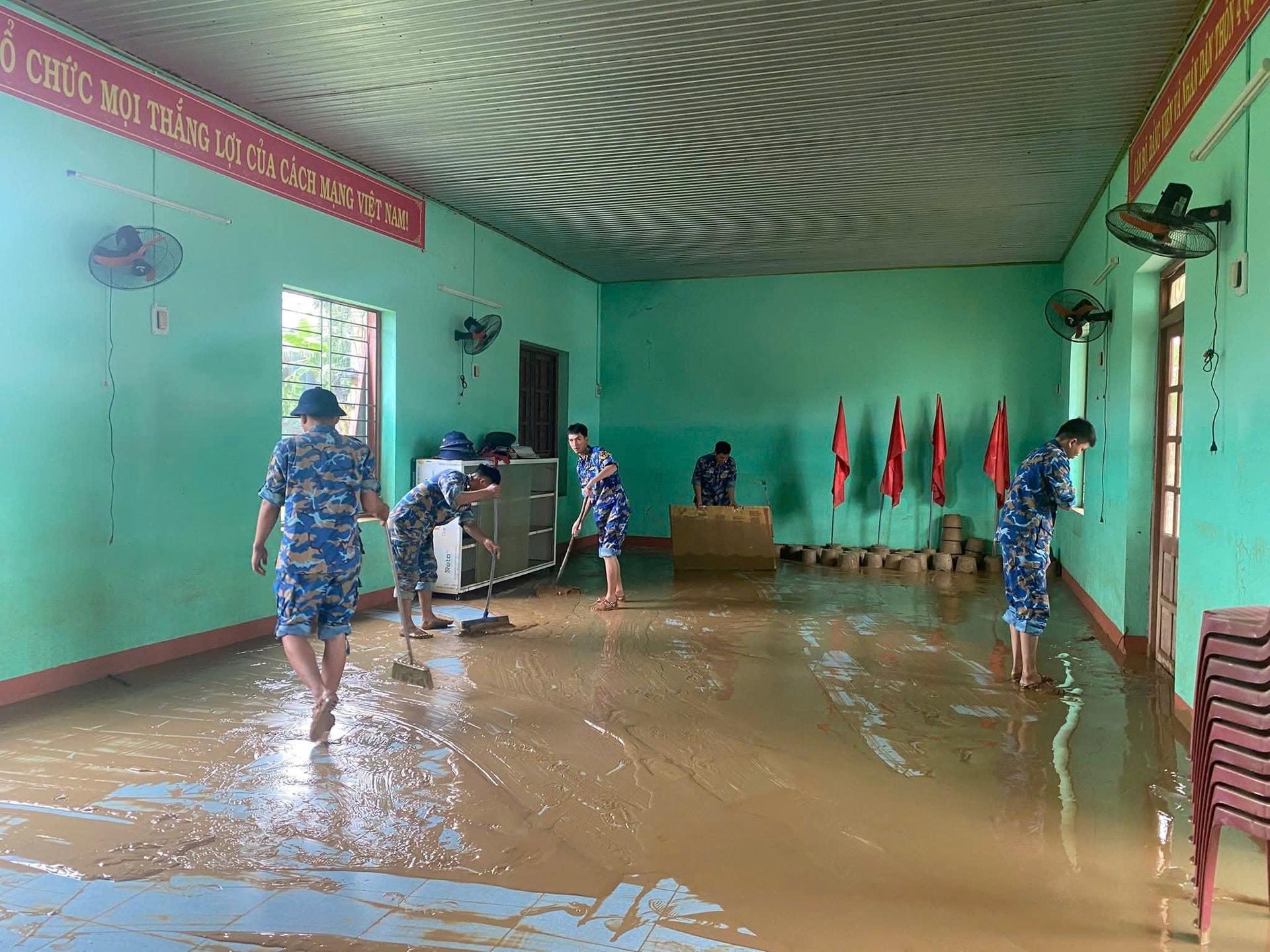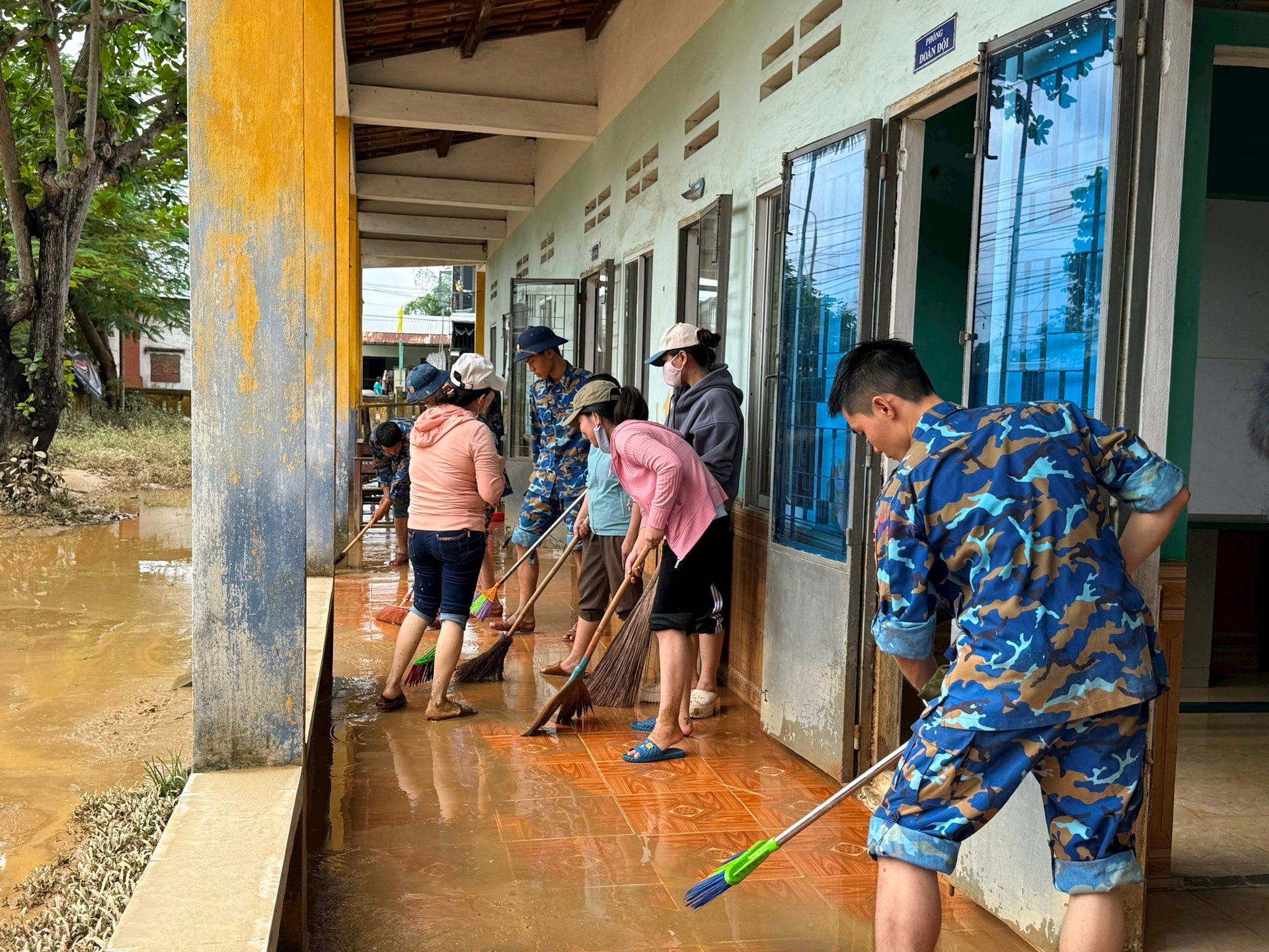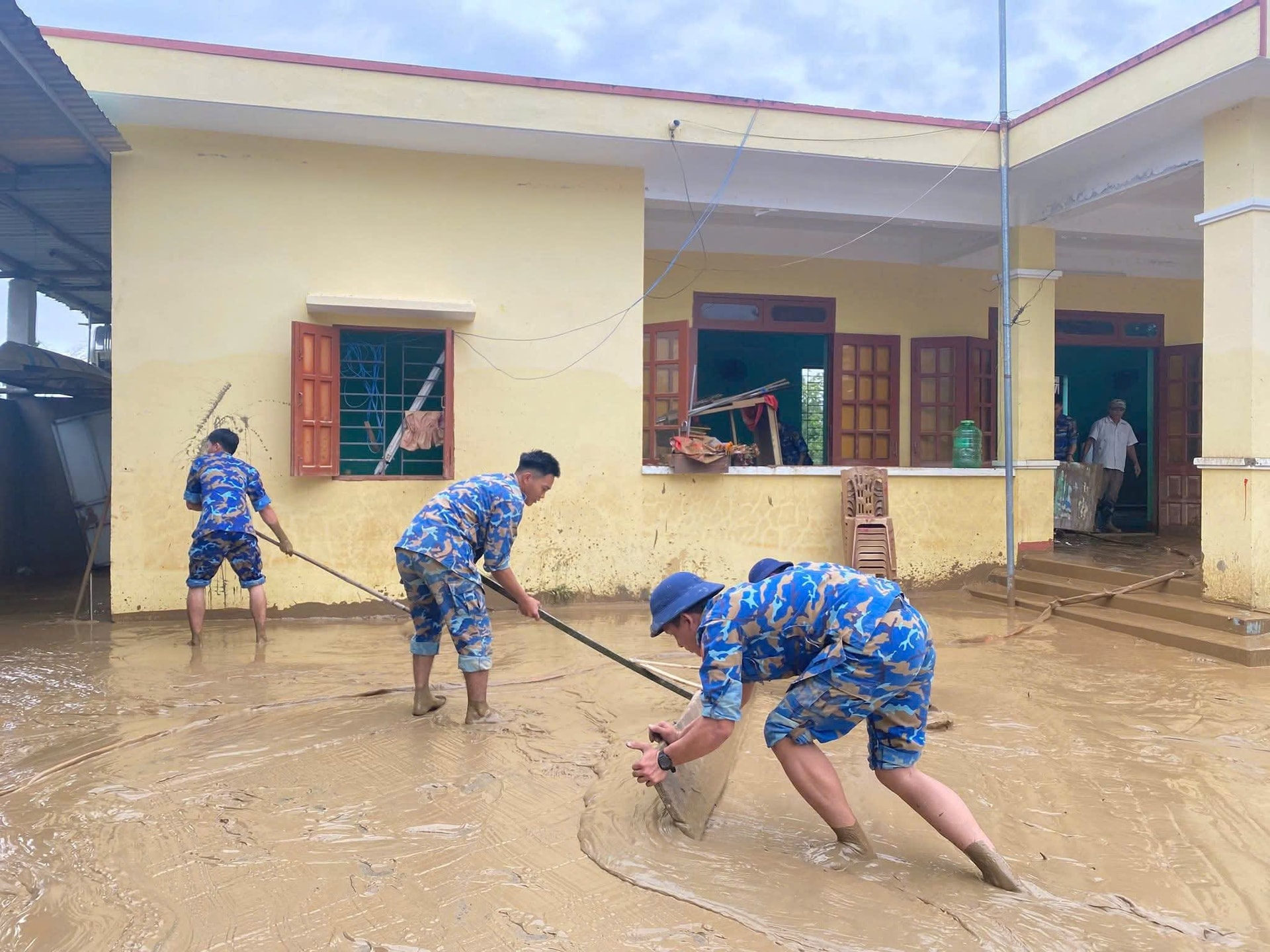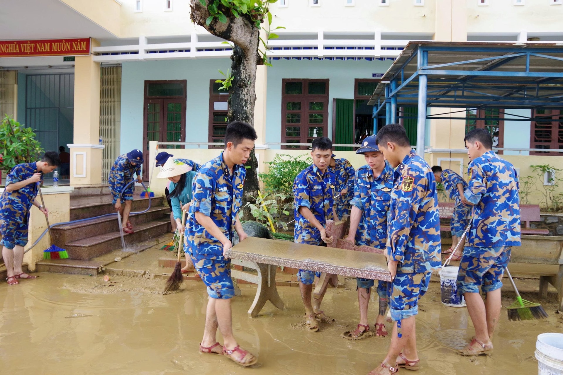 Cán bộ Lữ đoàn 83 cùng người dân dọn dẹp sau lũ.