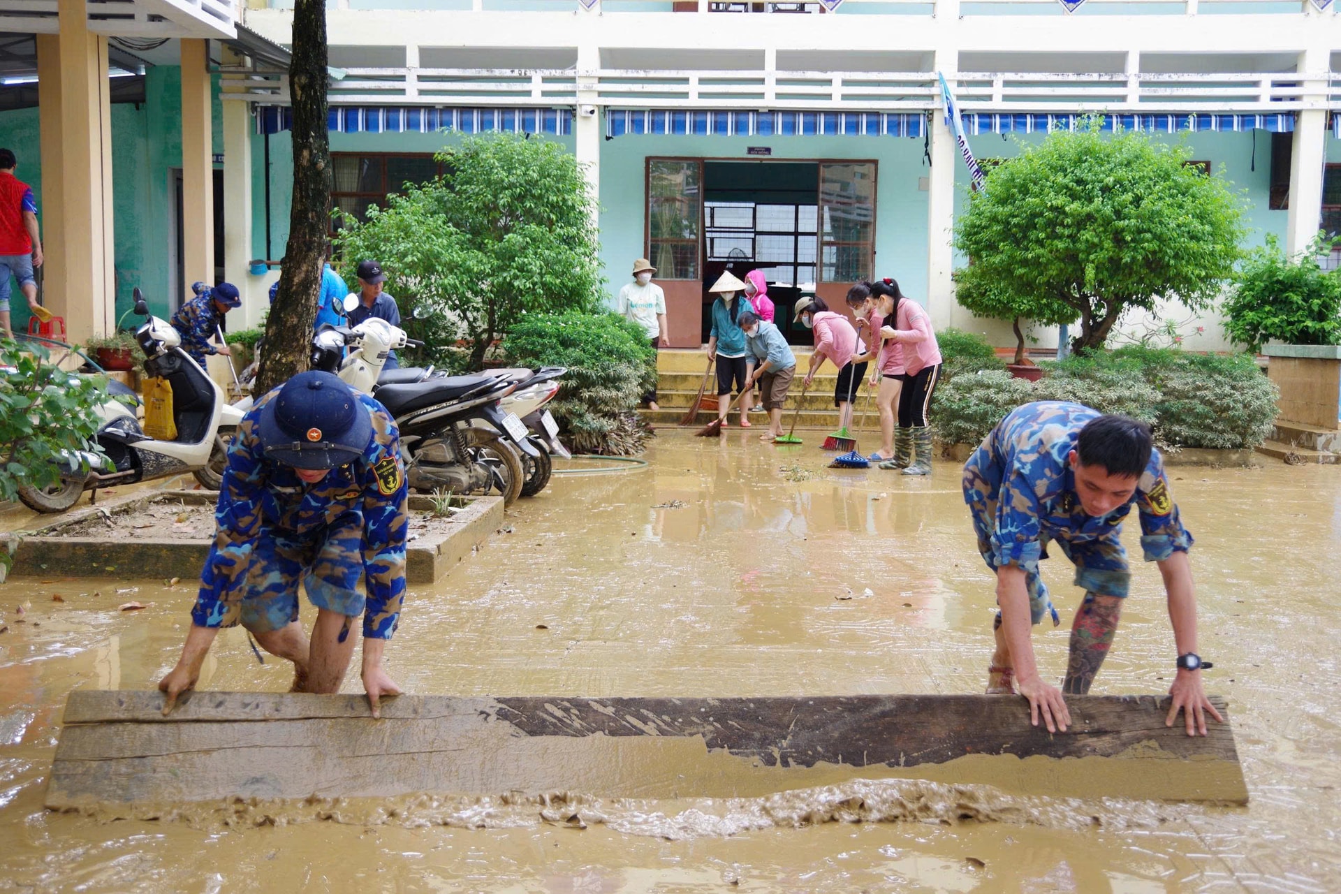Cán bộ, chiến sĩ Lữ đoàn 172 dọn dẹp bùn đất tại phường Hội An, TP. Đà Nẵng.