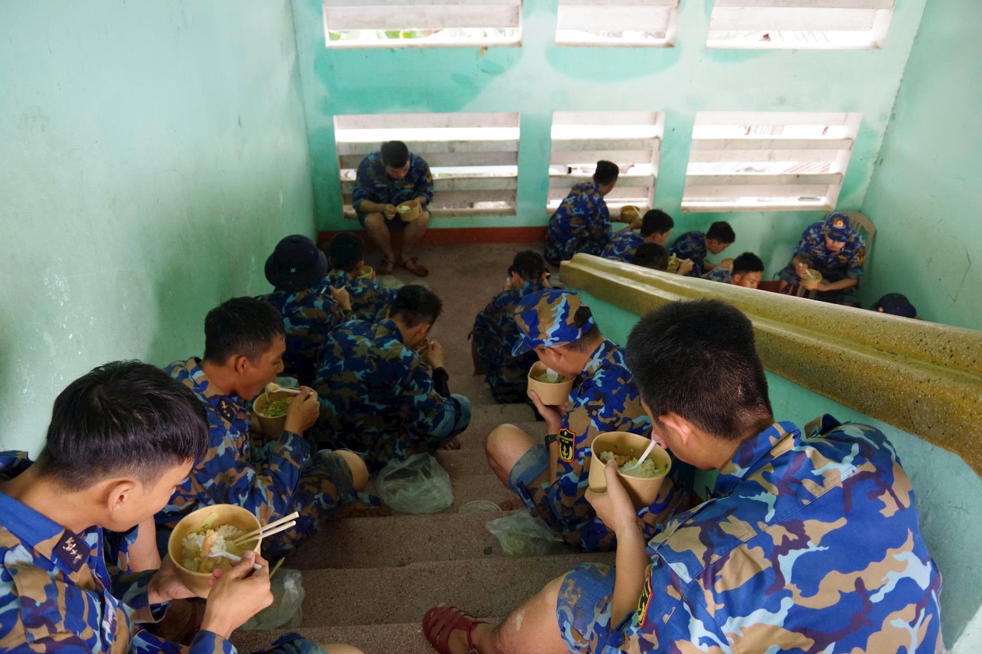 Bữa trưa vội của các chiến sĩ Lữ đoàn 83 tranh thủ dọn dẹp cùng nhân dân với tinh thần khẩn trương "nước rút đến đâu - dọn dẹp đến đó"