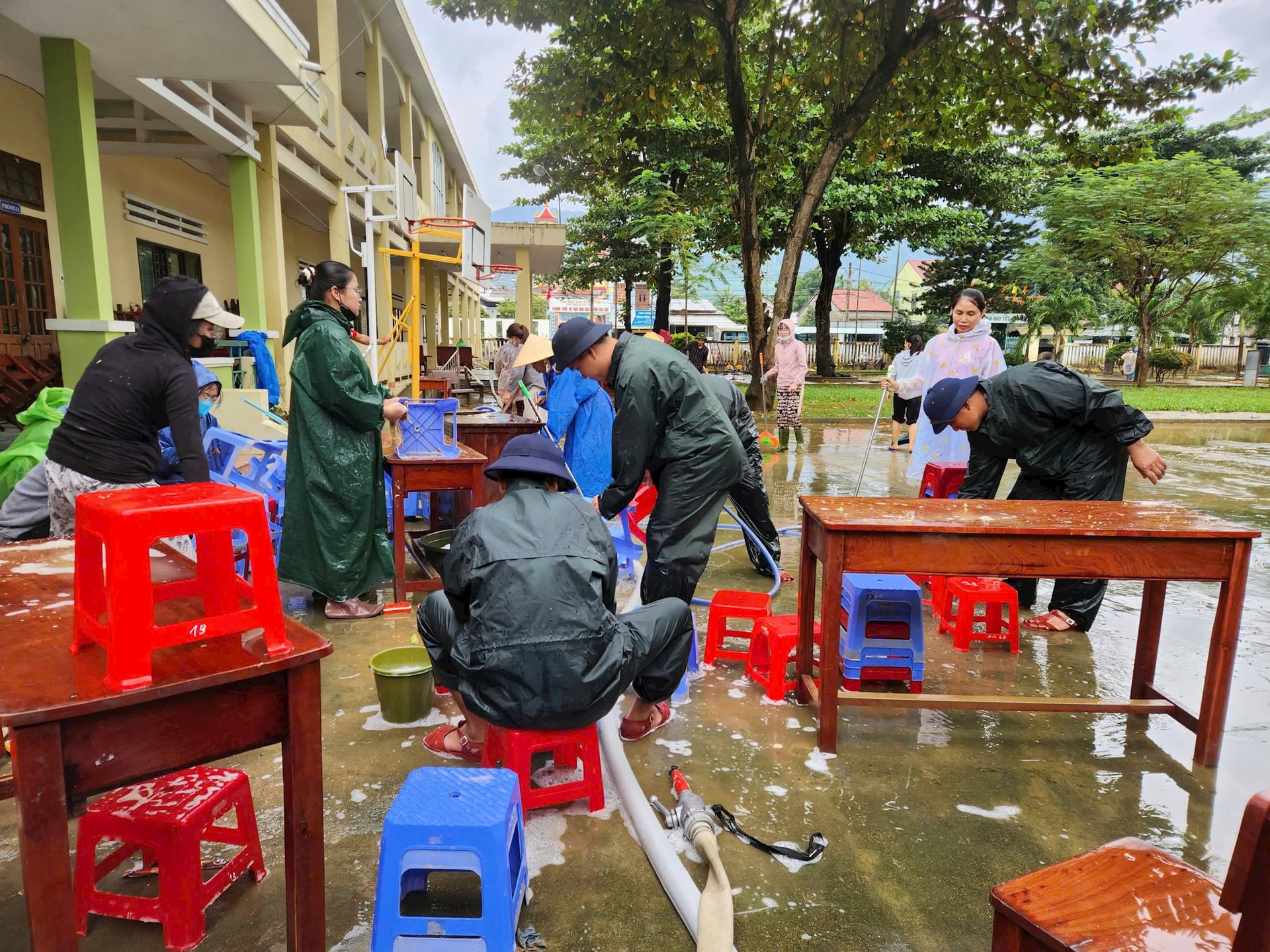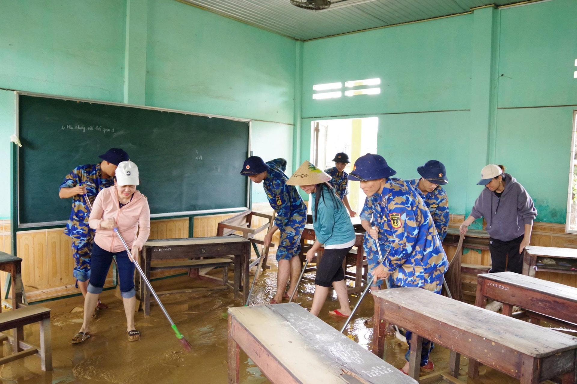 Cán bộ chiến sĩ Lữ đoàn 680 cùng các thầy cô giáo trường Tiểu học Đại Đồng vệ sinh bàn ghế nhà trường sau bão lụt.