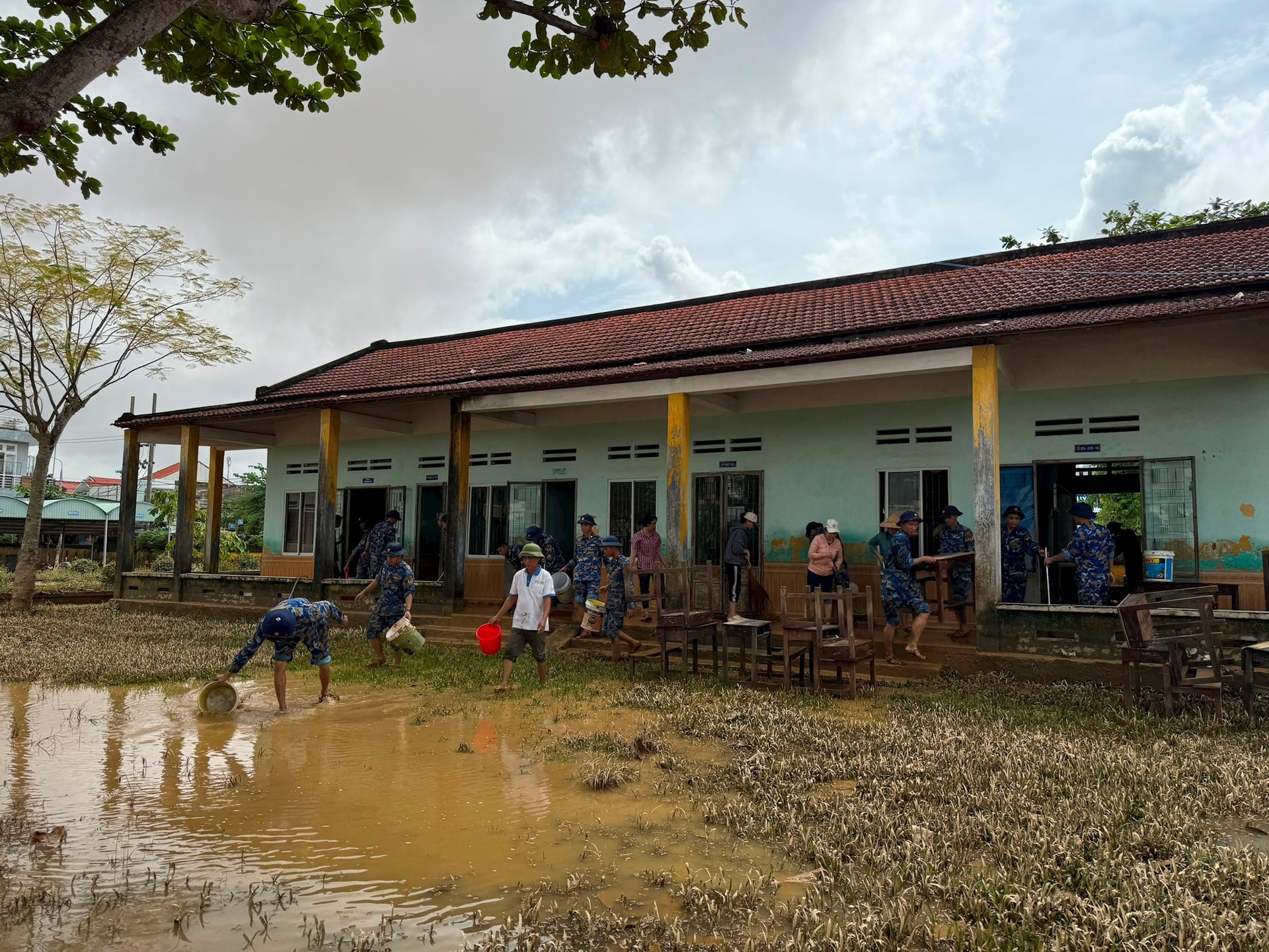 Cán bộ, chiến sĩ Tiểu đoàn 353 dọn dẹp Trường mầm non Điện Phương, phường Điện Bàn, TP. Đà Nẵng.