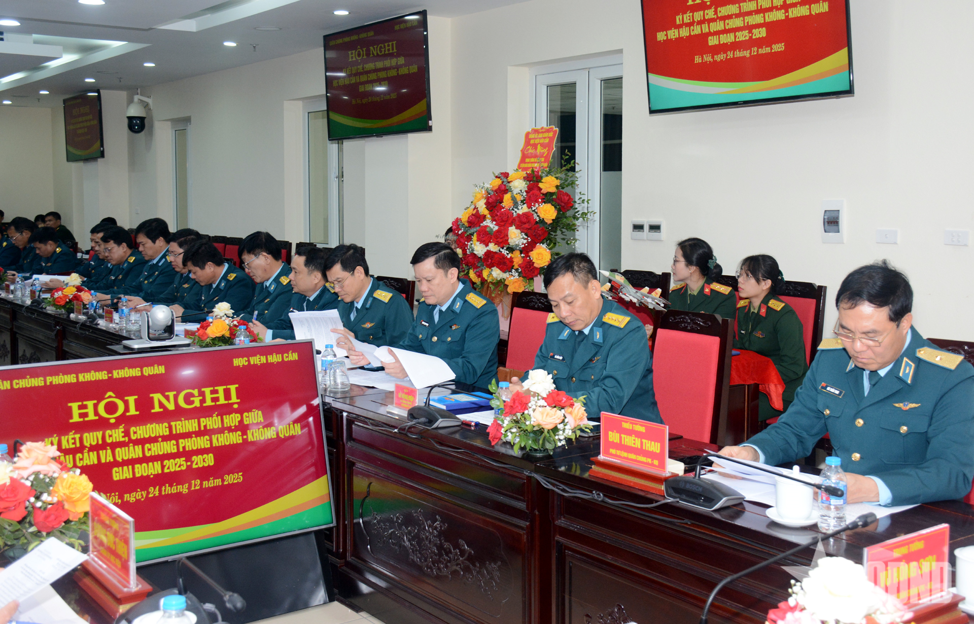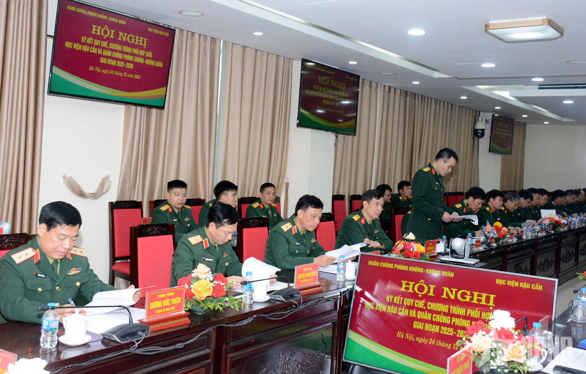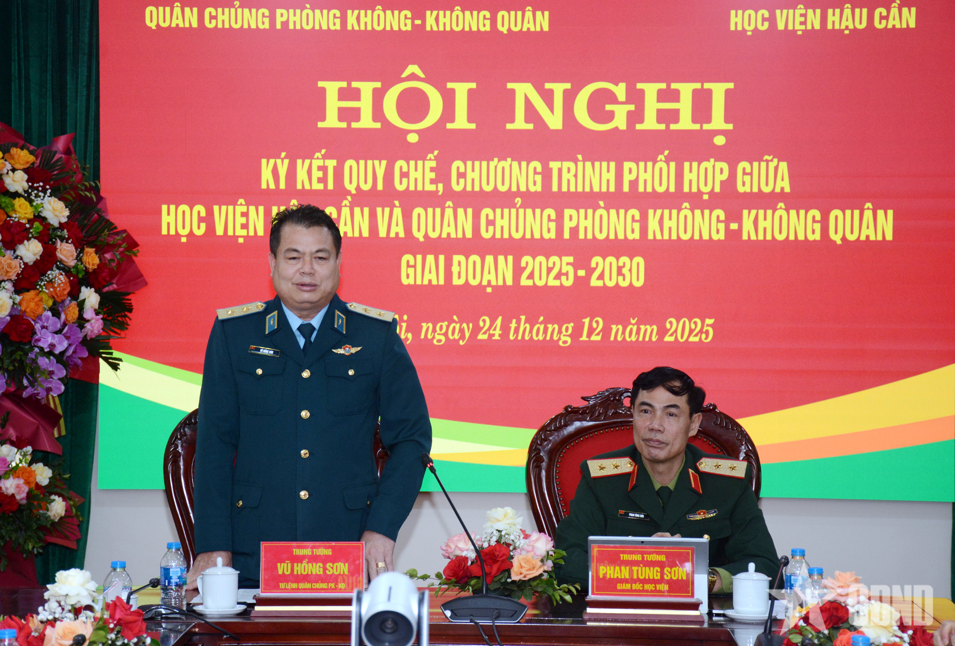 Phát biểu tại hội nghị ký kết, thay mặt Đảng ủy, Bộ tư lệnh Quân chủng Phòng không - Không quân, Trung tướng Vũ Hồng Sơn bày tỏ sự phấn khởi khi thời gian qua luôn nhận được sự phối hợp chặt chẽ, hiệu quả của Học viện Hậu cần. Đồng chí Tư lệnh Quân chủng giới thiệu khái quát về đặc điểm tình hình của đơn vị và đánh giá cao nội dung chương trình phối hợp giữa hai đơn vị; mong muốn trên cơ sở quy chế, chương trình được ký kết, công tác phối hợp giữa hai bên sẽ đạt nhiều kết quả thiết thực hơn nữa, góp phần nâng cao chất lượng giáo dục, đào tạo và công tác bảo đảm hậu cần, kỹ thuật, tài chính của cả Học viện Hậu cần và Quân chủng Phòng không - Không quân. Đồng thời khẳng định, Quân chủng Phòng không - Không quân sẽ tạo điều kiện thuận lợi nhất để giúp Học viện đưa các học viên đến thực tập, nghiên cứu thực tế, tham quan mô hình và thực hiện các hoạt động ngoại khóa, bổ trợ khác.