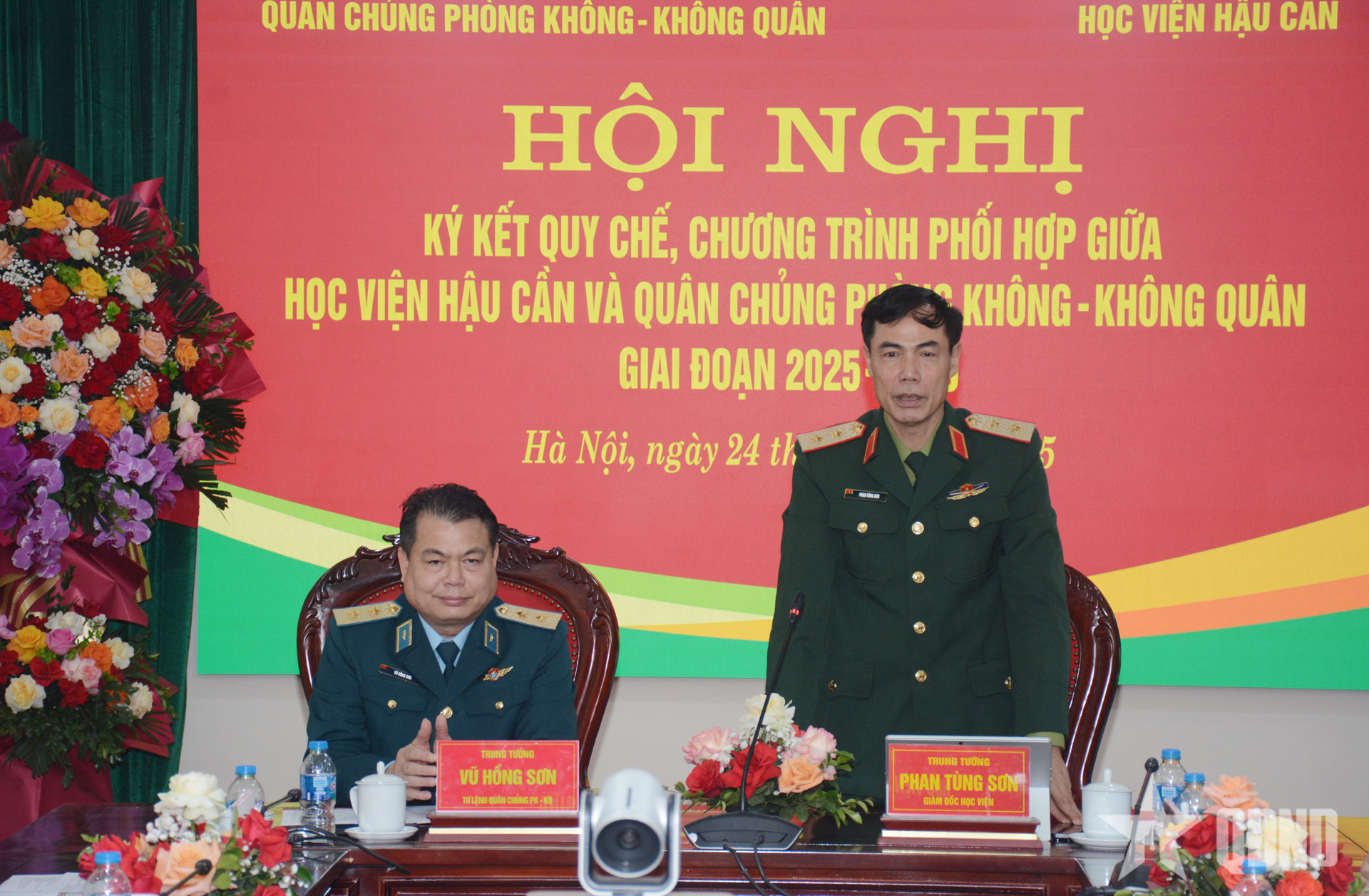 Thay mặt Đảng ủy, Ban giám đốc Học viện Hậu cần, Trung tướng, GS, TS Phan Tùng Sơn trân trọng cảm ơn và đánh giá cao sự quan tâm, tạo điều kiện của lãnh đạo, chỉ huy Bộ tư lệnh Quân chủng Phòng không - Không quân đối với công tác giáo dục đào tạo, nghiên cứu khoa học của Học viện Hậu cần những năm qua. Để công tác phối hợp giữa hai đơn vị đạt hiệu quả thiết thực hơn nữa trong thời gian tới, đồng chí đề nghị các cơ quan chức năng của hai đơn vị tăng cường trao đổi, chủ động xây dựng, triển khai kế hoạch thực hiện từng nội dung trong chương trình phối hợp bảo đảm chặt chẽ, phù hợp, đồng bộ, thống nhất.