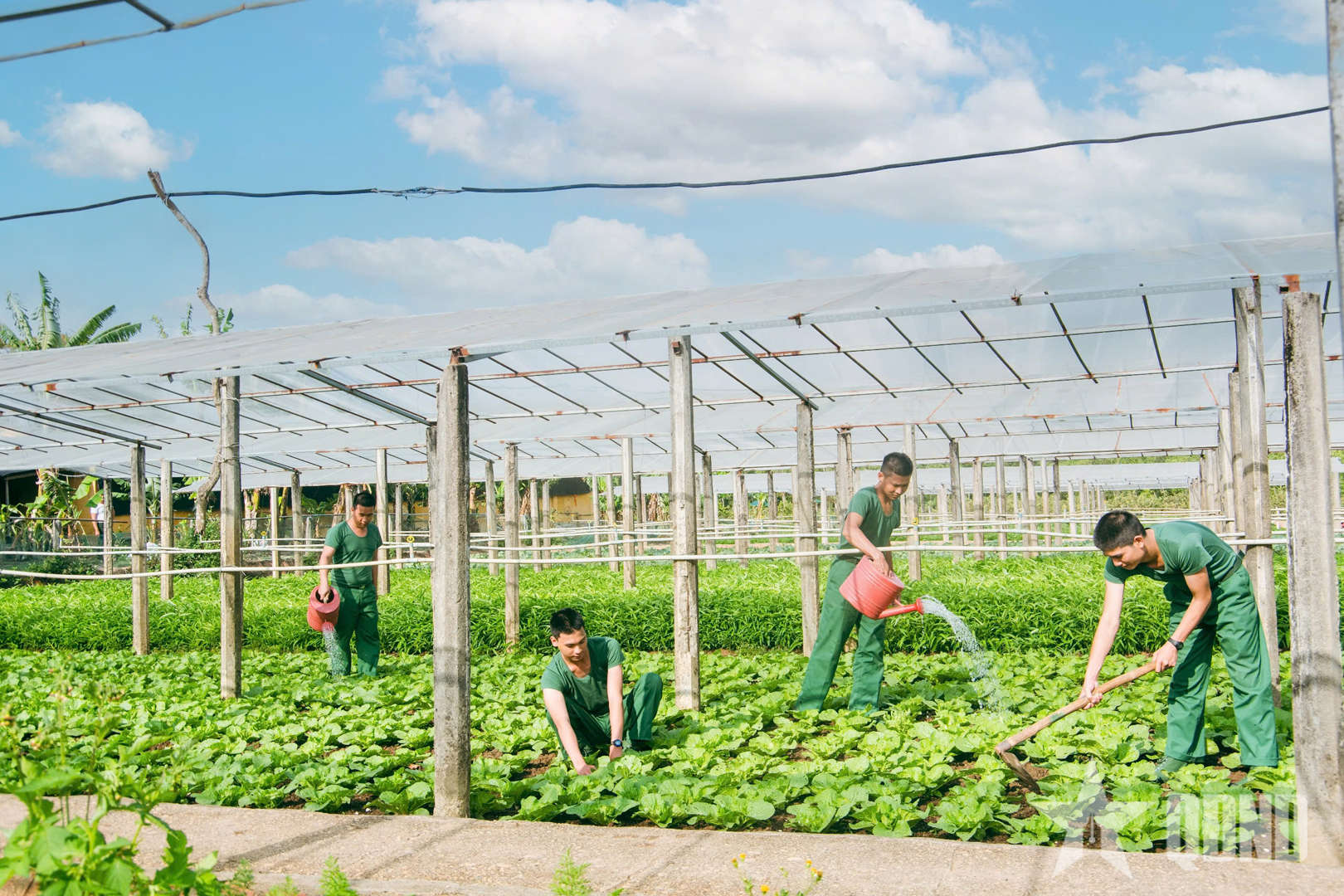 Tại khu tăng gia sản xuất tập trung của đơn vị vào giờ nghỉ, ngày nghỉ, không khí lao động luôn rộn ràng, sôi nổi. Từng nhóm chiến sĩ mới được cán bộ hướng dẫn tỉ mỉ từ cách cải tạo đất, lên luống, chọn giống đến chăm sóc cây trồng.