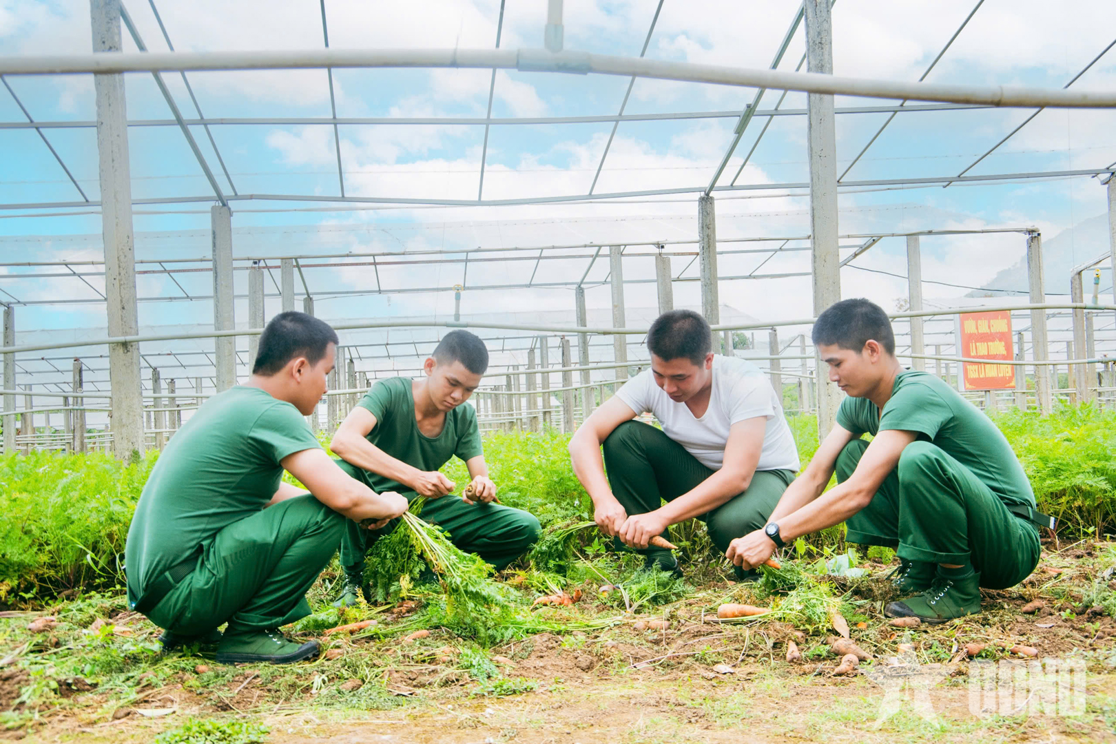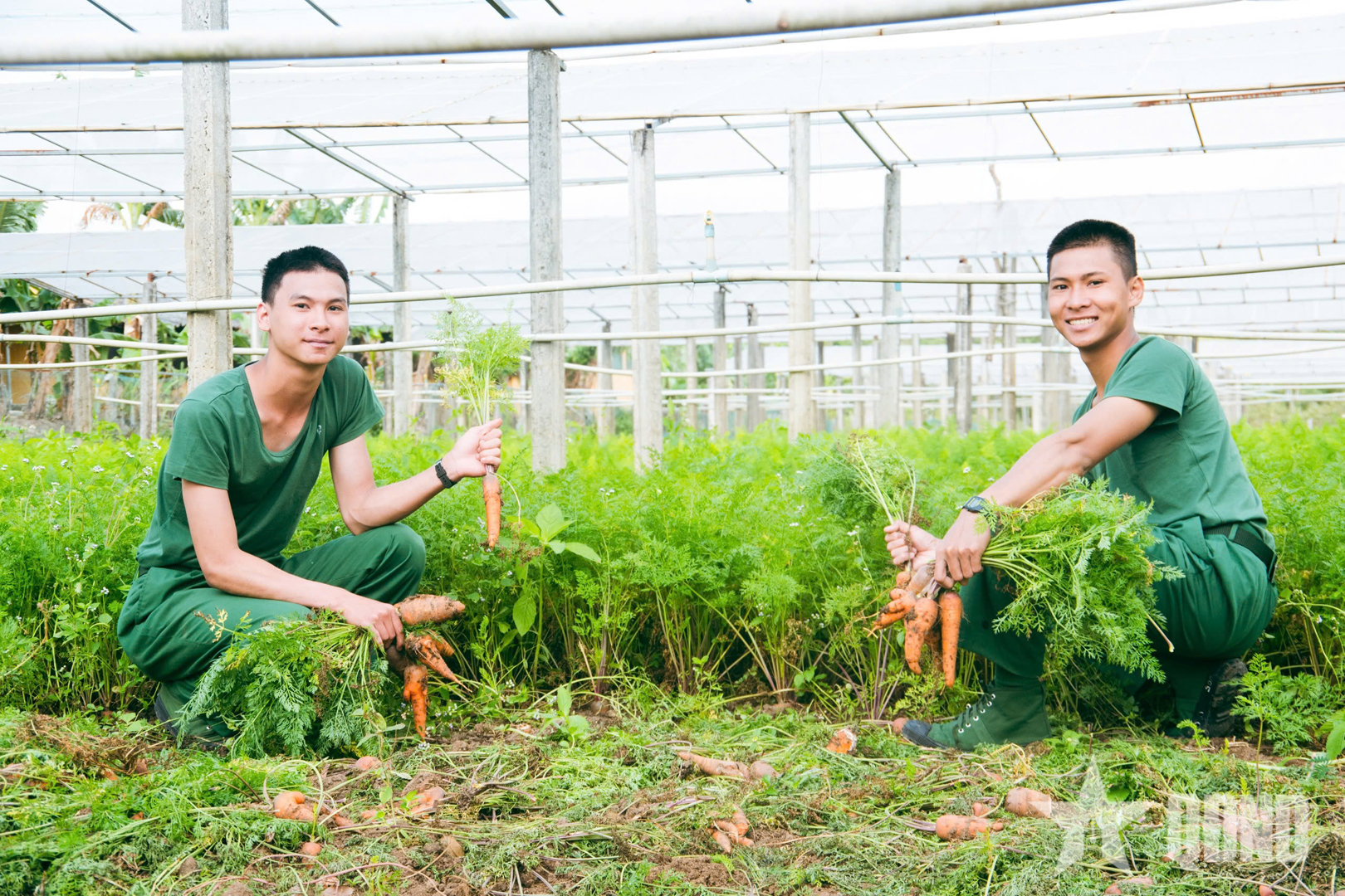 Cán bộ trung đội cùng chiến sĩ mới thu hoạch cà rốt, chia sẻ kinh nghiệm trồng hoa màu.