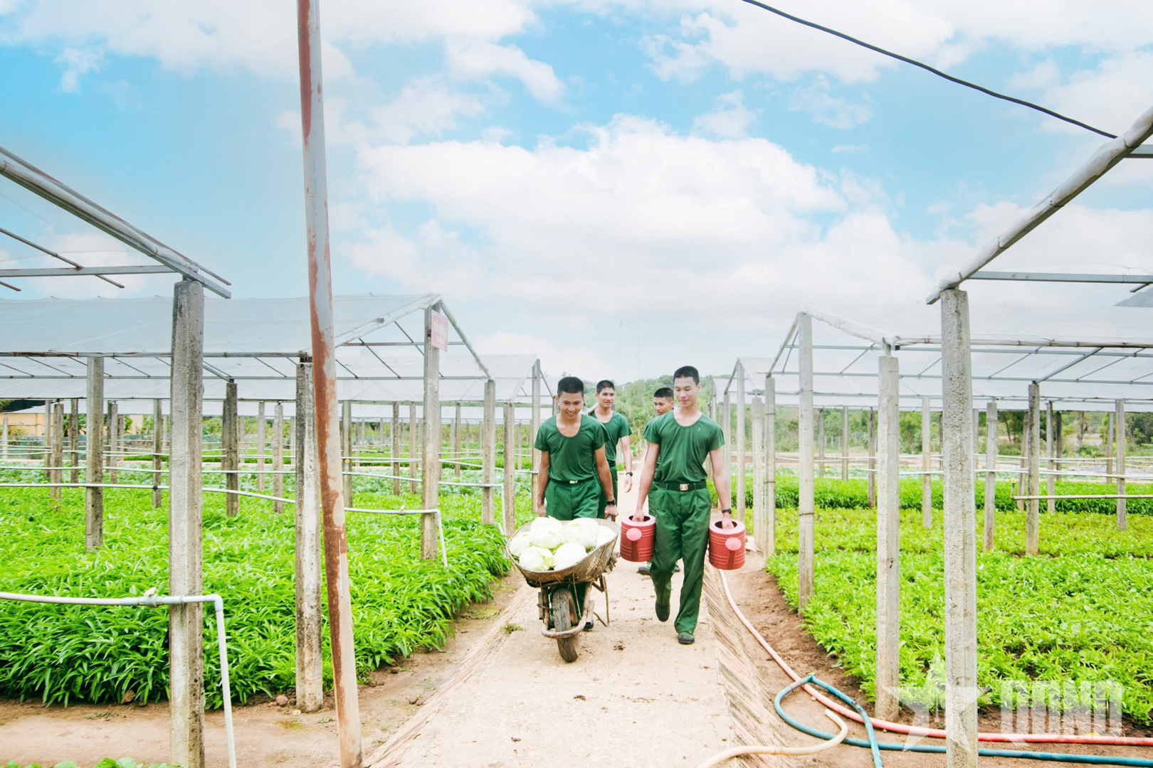 Niềm vui của cán bộ, chiến sĩ trên vườn tăng gia sản xuất.