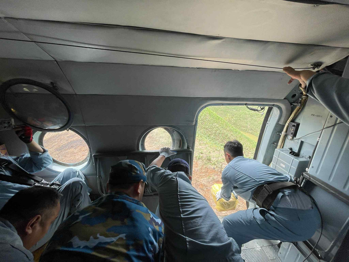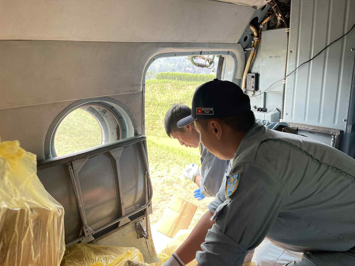 Các thành viên tổ bay vận chuyển và thả hàng cứu trợ xuống xã Yên Bình, tỉnh Lạng Sơn. Ảnh: Quân chủng PK-KQ.