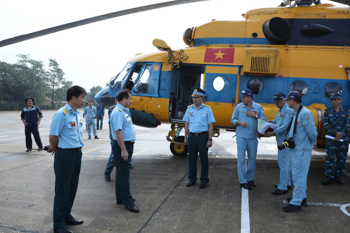 Thiếu tướng Vũ Hồng Sơn - Tư lệnh Quân chủng PK-KQ kiểm tra, nắm tình hình tổ bay trước khi thực hiện nhiệm vụ bay cứu trợ. Ảnh: Quân chủng PK-KQ.