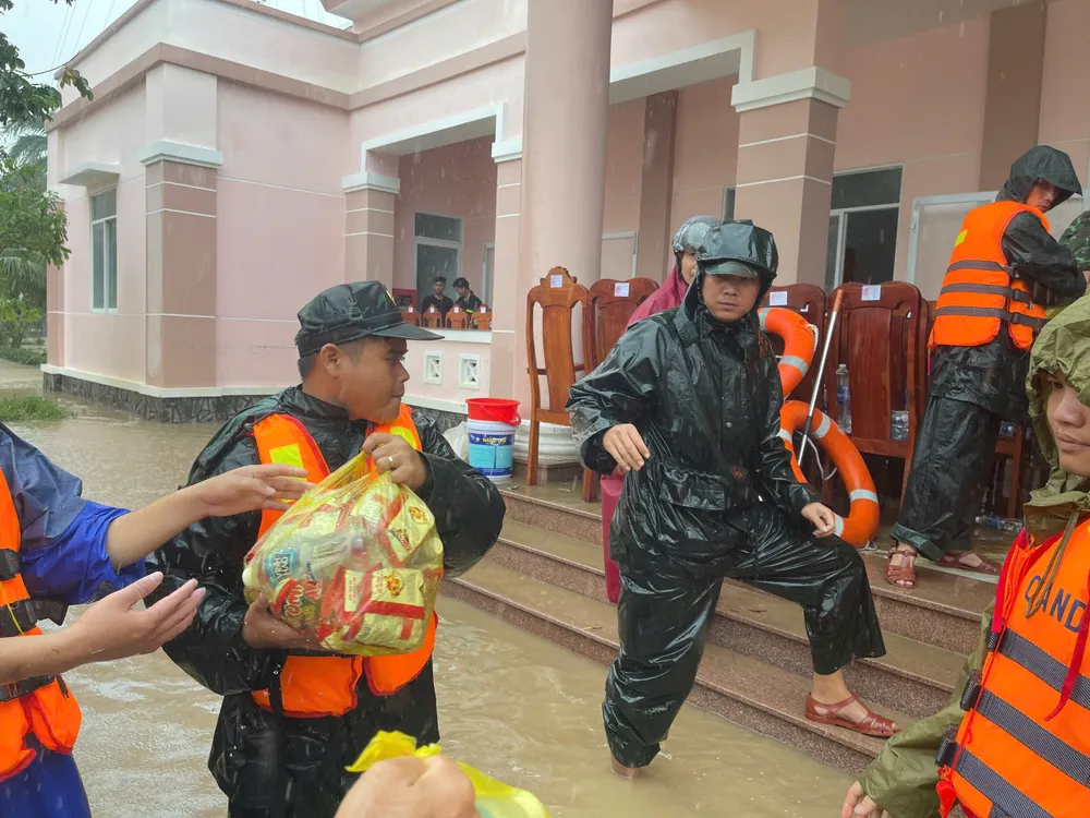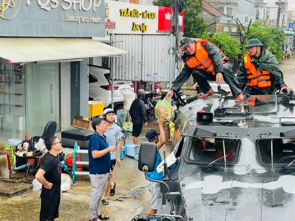 Trước tình hình khẩn cấp, Quân khu 5 đã điều động lực lượng và xe thiết giáp vượt nước chảy xiết, tiếp tế hàng nghìn suất nhu yếu phẩm đến với người dân vùng ngập sâu.