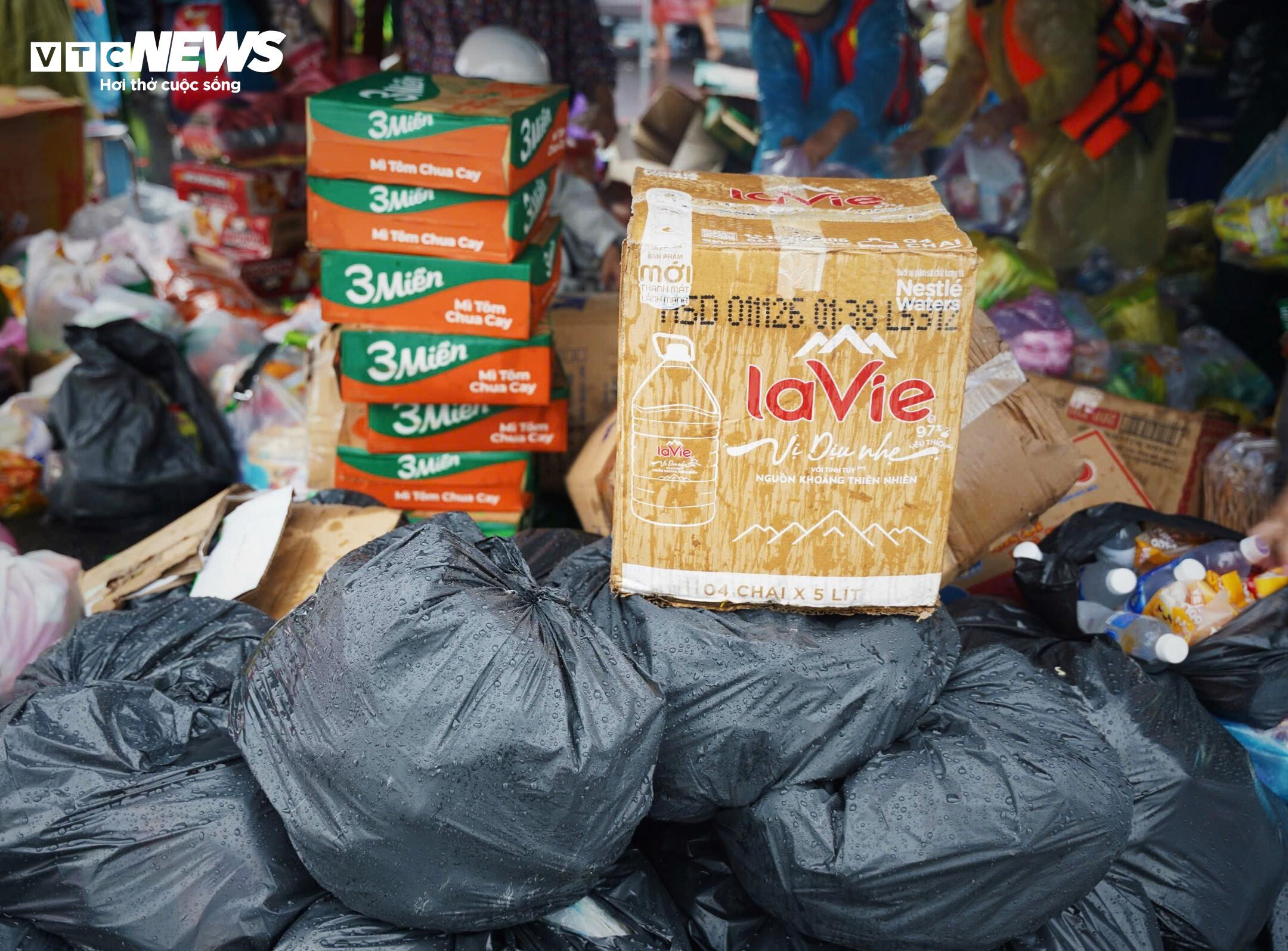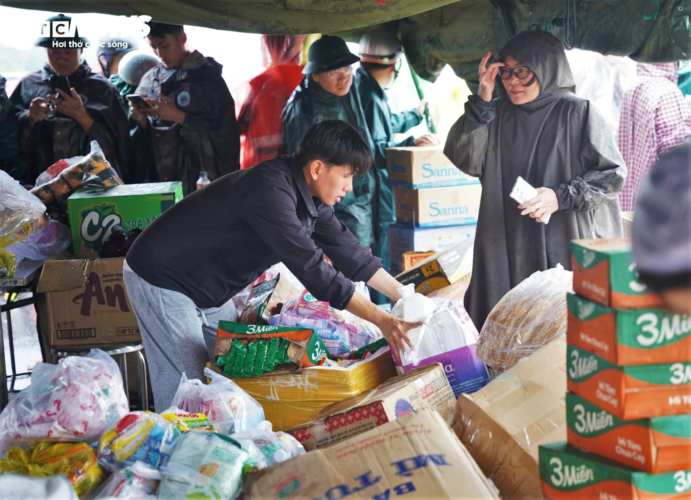Hàng trăm suất lương thực từ các đội cứu trợ, doanh nghiệp và chính quyền địa phương được tập kết và phân phát miễn phí cho người dân vùng lũ.