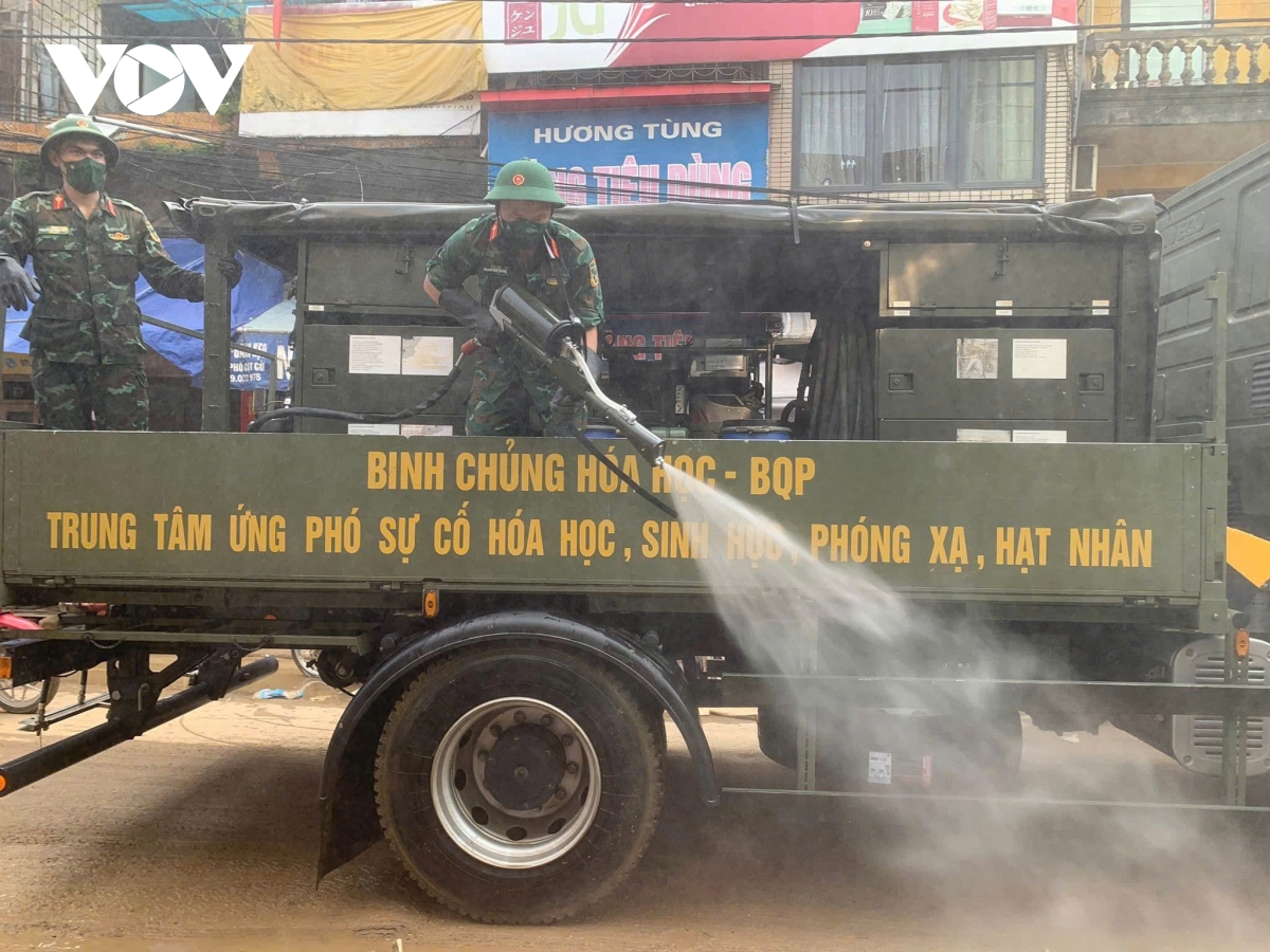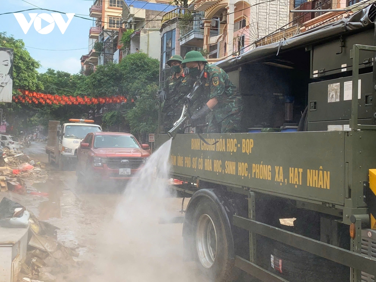 Binh chủng hóa học phun khử khuẩn tại các khu vực lũ rút.