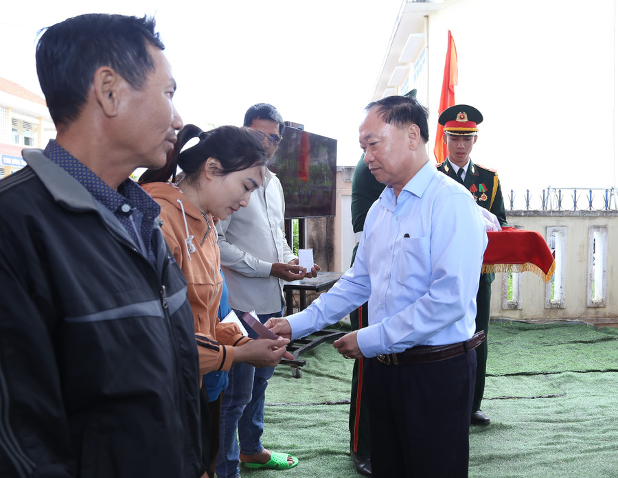 Bí thư Tỉnh ủy Thái Đại Ngọc tặng quà cho các gia đình nhân dịp có nhà mới. Ảnh: H.P