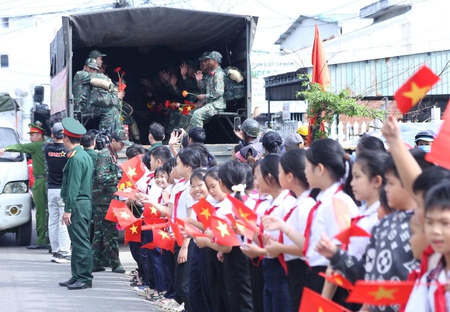 Sau khi hoàn thành nhiệm vụ giúp dân xây nhà, bộ đội lên đường về đơn vị trong niềm thương nhớ của người dân địa phương. Ảnh: H.P