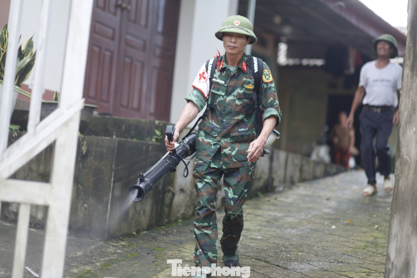Nước lũ vừa rút, các chiến sĩ đã có mặt phun khử khuẩn xử lý môi trường.