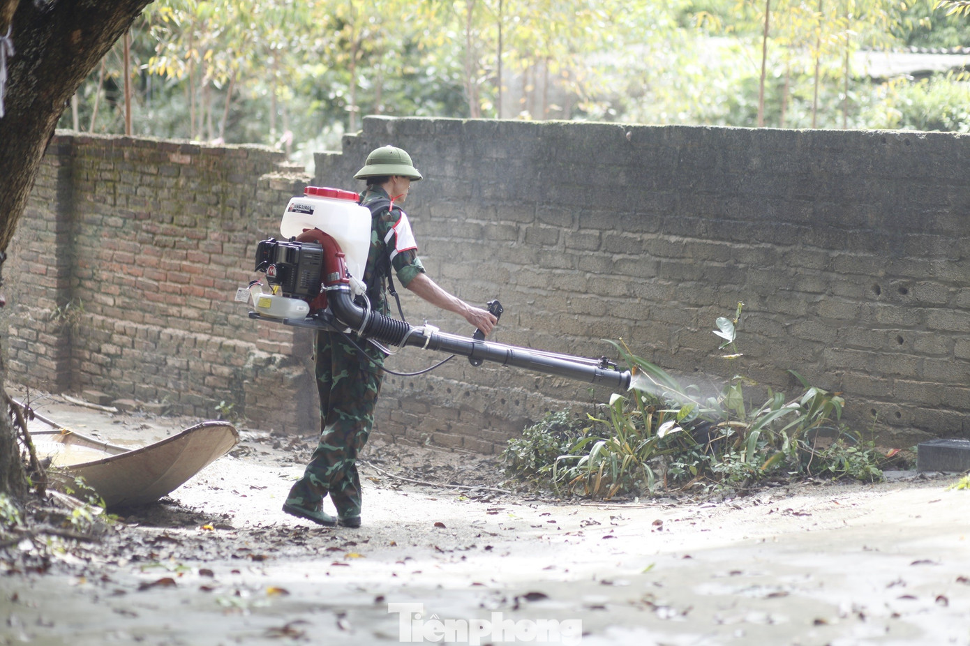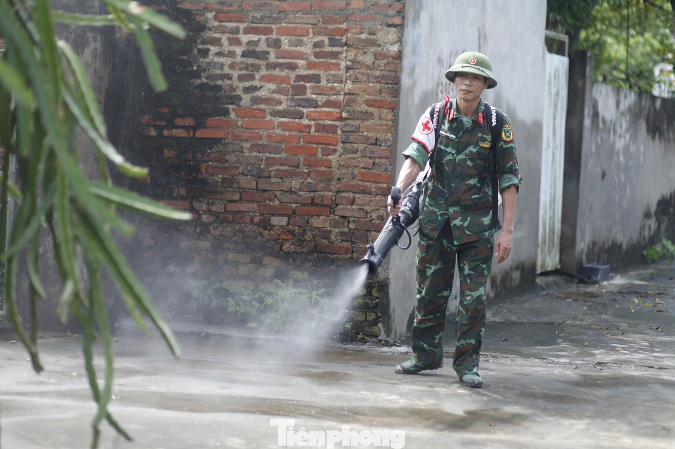 Trong những ngõ nhỏ, xe đặc chủng không thể vào được, các chiến sĩ quân đội tổ chức phun khử khuẩn đường làng và nhà dân.