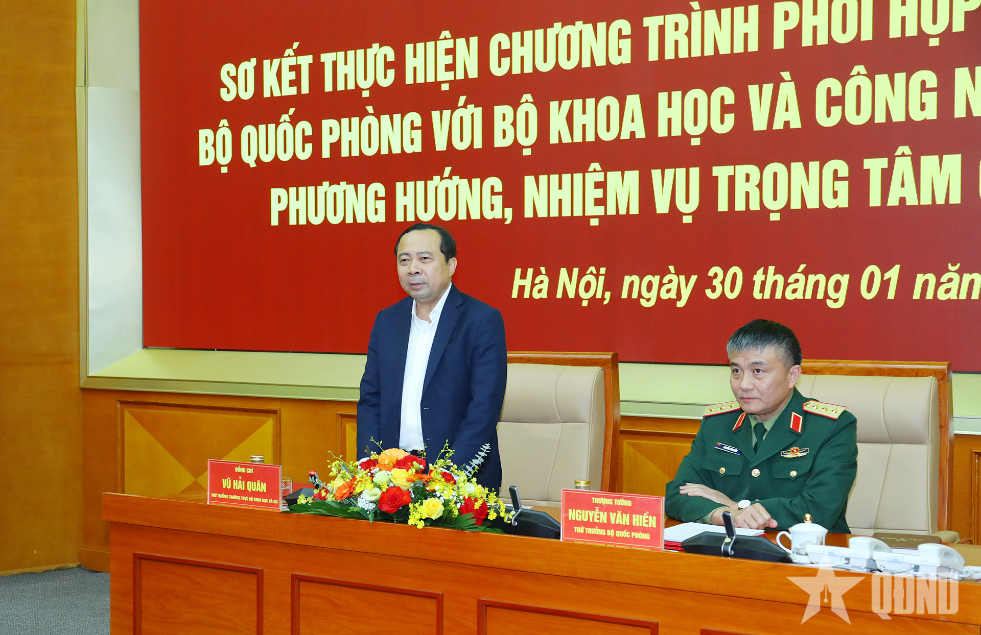 Thượng tướng Nguyễn Văn Hiền, Ủy viên Trung ương Đảng, Thứ trưởng Bộ Quốc phòng và đồng chí Vũ Hải Quân, Ủy viên Trung ương Đảng, Thứ trưởng Thường trực Bộ KHCN đồng chủ trì hội nghị.