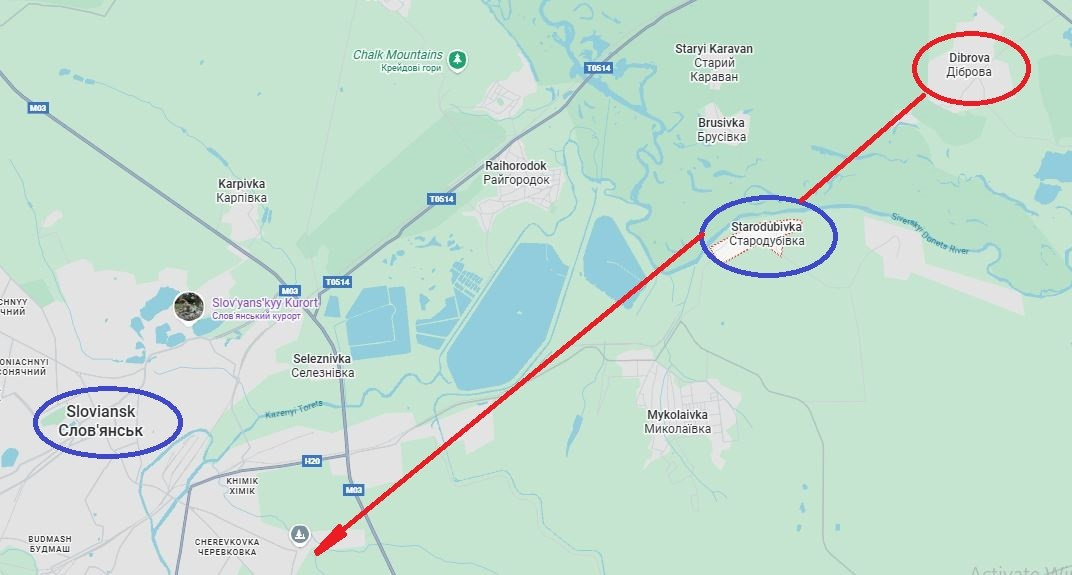 Một khi quân Nga kiểm soát hoàn toàn Dibrova, họ sẽ có thể tiến đến bờ đông sông Seversky Donets từ hướng này, hướng khu vực làng Starodubovka (được đánh dấu trên mảnh bản đồ). Về cơ bản, đây là ngôi làng cuối cùng sau Dibrova, có thể ngăn cản quân Nga tiếp cận với thành phố “song sinh” Slavyansko-Kramatorsk ở phía đông bắc.