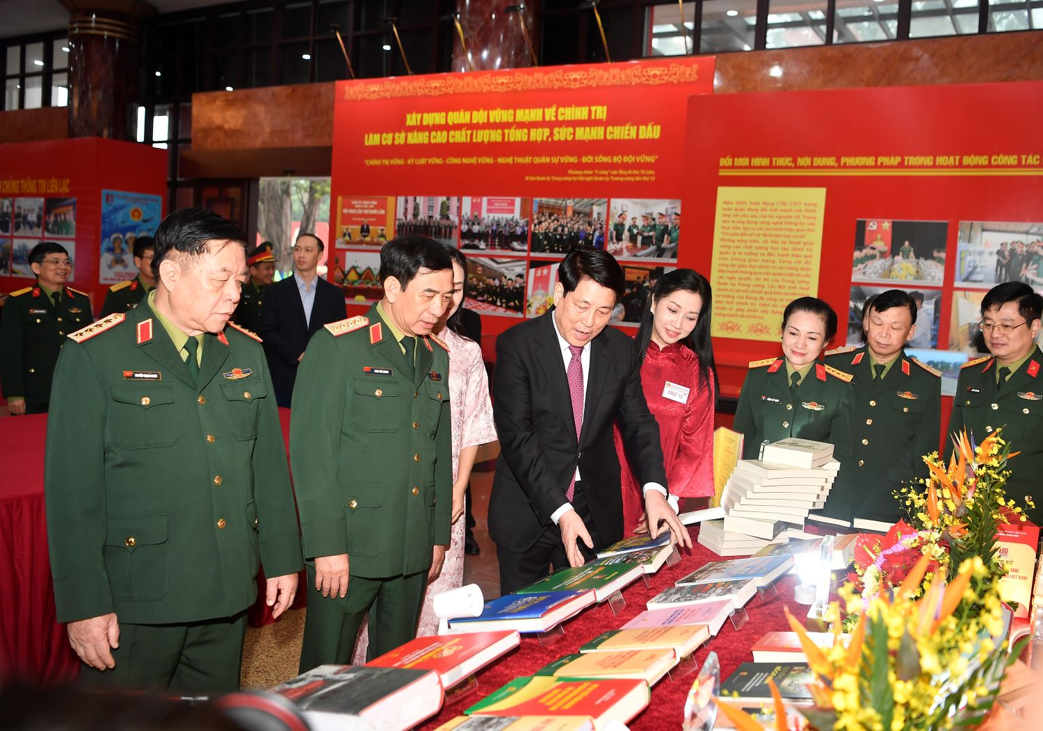 Chủ tịch nước Lương Cường và lãnh đạo Bộ Quốc phòng tham quan các gian trưng bày tại Hội nghị quân chính toàn quân năm 2025. Ảnh: VŨ PHONG