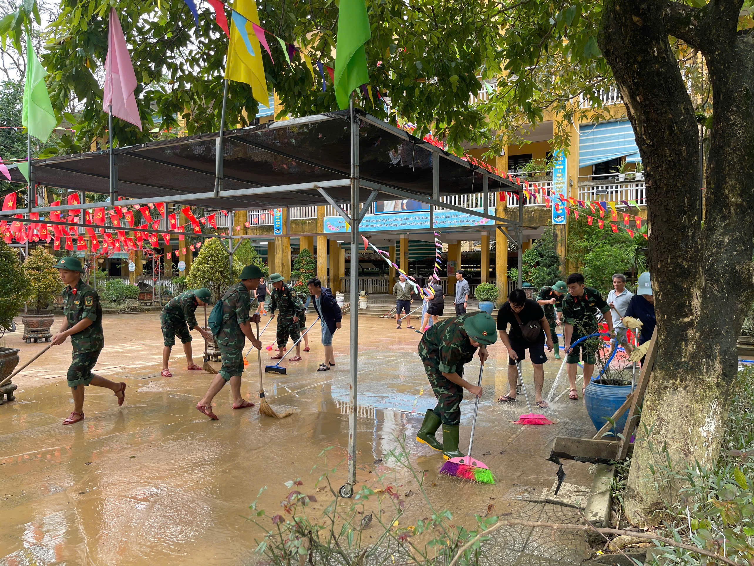 Trong đó, ưu tiên dọn bùn đất, thu gom rác thải, khử khuẩn các khu dân cư, trường học, trạm y tế. Đồng thời, giúp sửa chữa, vệ sinh trang thiết bị, bàn ghế, phòng học để học sinh sớm được trở lại trường lớp sau thời gian nghỉ học tránh lũ, bảo đảm an toàn và sức khỏe cho người dân sau lũ.