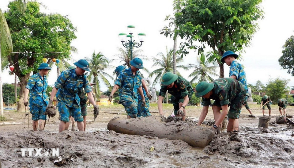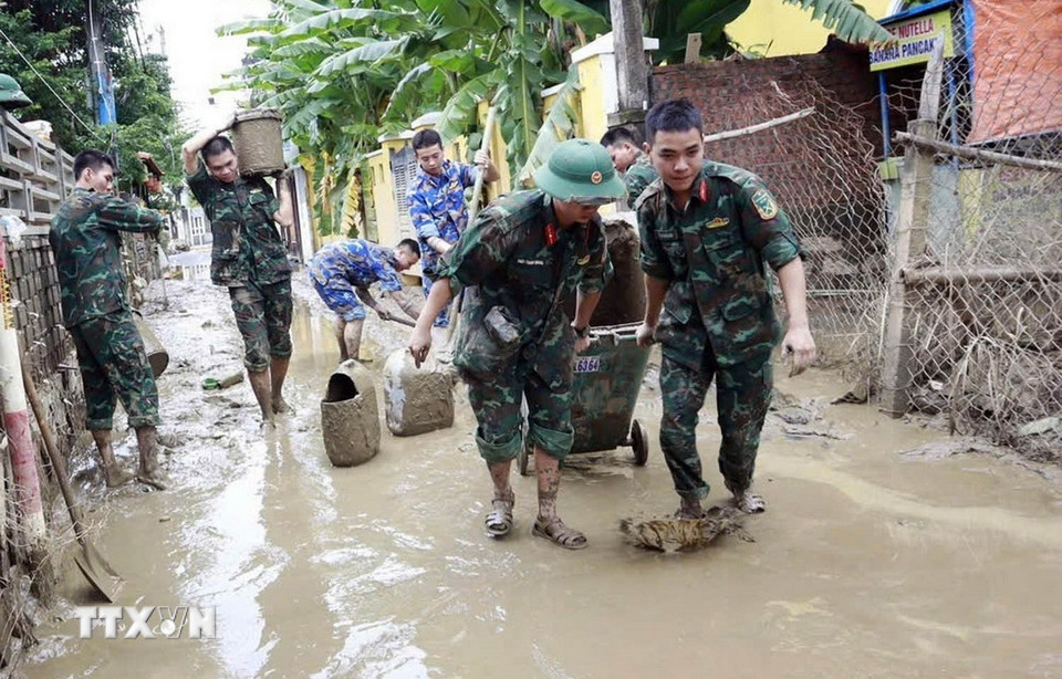 Bộ đội giúp nhân dân làm sạch, thu gom rác thải, tẩy rửa môi trường. (Ảnh: Trần Tĩnh/TTXVN)