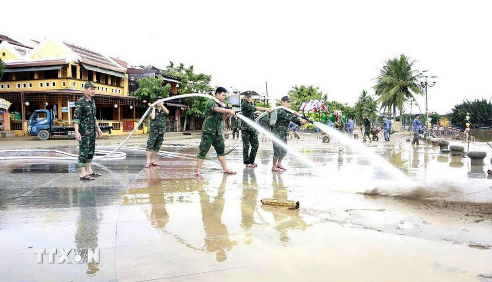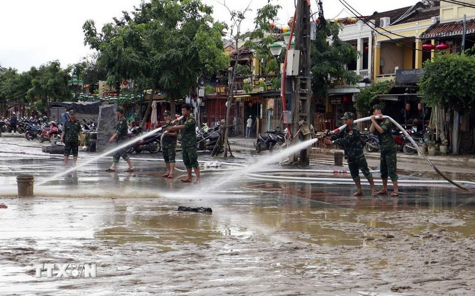 Bộ Chỉ huy Quân sự thành phố Đà Nẵng triển khai hơn 100 cán bộ, chiến sỹ cùng phương tiện, máy móc cơ giới và trang bị tẩy rửa, khẩn trương cơ động vào khu vực phố cổ Hội An giúp chính quyền và nhân dân làm sạch, thu gom rác thải, tẩy rửa môi trường. (Ảnh: Trần Tĩnh/TTXVN)