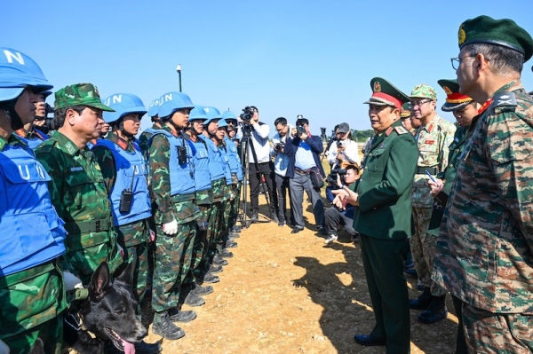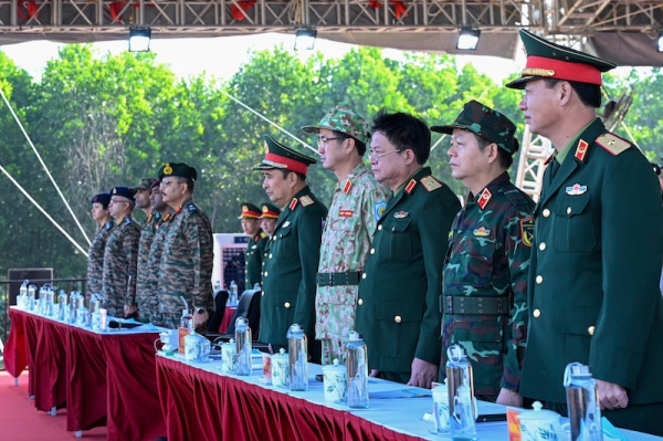 Thượng tướng Phùng Sĩ Tấn và các đại biểu dự buổi trình diễn tình huống tích hợp trên thực địa trong khuôn khổ VINBAX 2025.